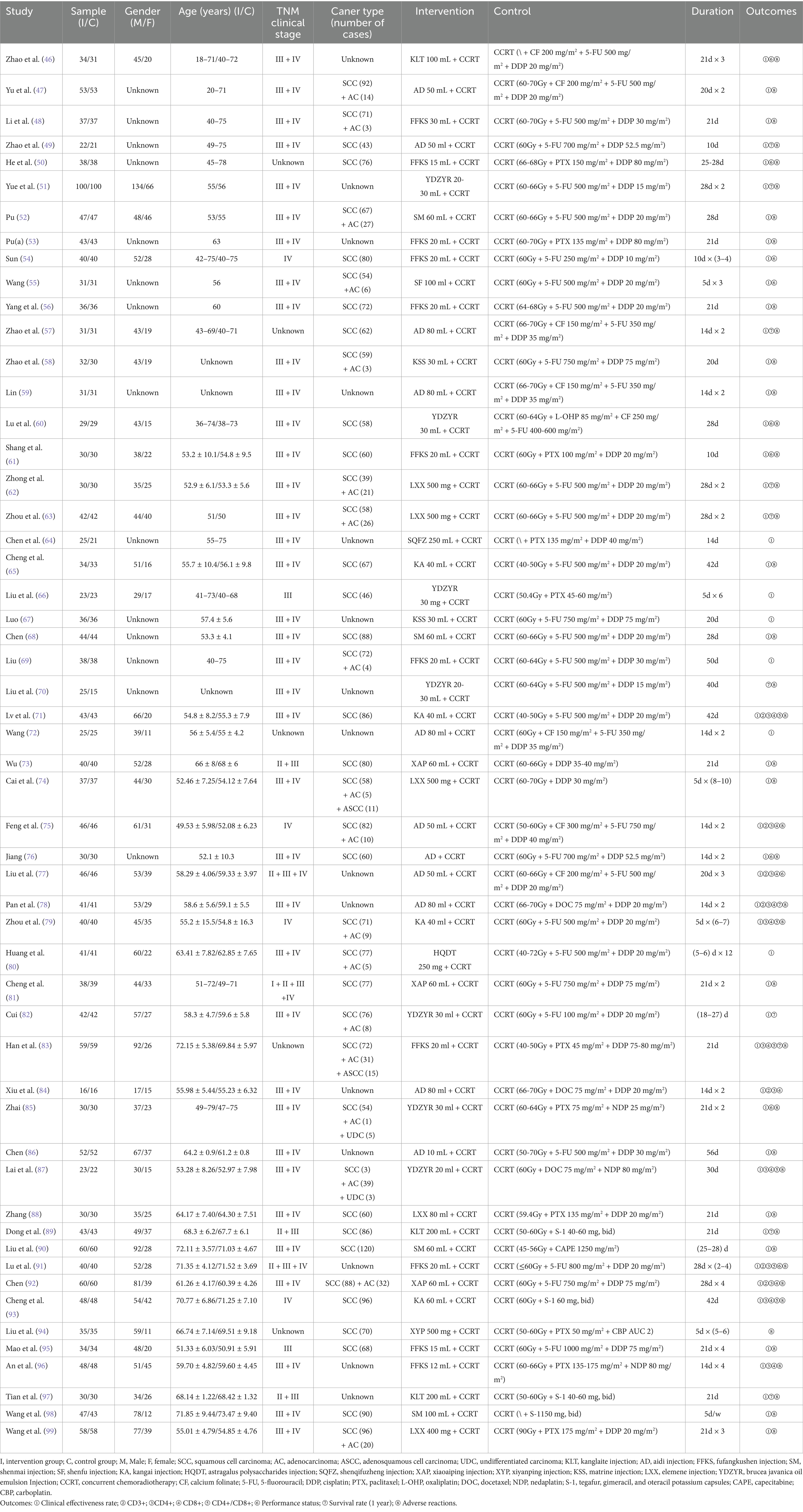The 54 eligible studies (46–99) were all conducted in China and involved 4,201 patients. Among them, 2,113 patients in the experimental cohort received CMIs+CCRT, while 2,088 in the control cohort received only CCRT. Most patients had squamous cell carcinoma (SCC) or adenocarcinoma (AC). Two studies (74, 83) focused on adenosquamous carcinoma (ASCC), and another two studies (85, 87) included cases of undifferentiated carcinoma (UDC). The TNM staging of patients ranged from stage I to IV, and the intervention durations varied from 10 to 112 days. 13 types of CMIs were involved, including AD (11 RCTs), FFKS (11 RCTs), SM (4 RCTs), SF (1 RCT), KLT (3 RCTs), KA (4 RCTs), HQDT (1 RCT), SQFZ (1 RCT), XAP (3 RCTs), XYP (1 RCT), KSS (2 RCTs), LXX (5 RCTs), and YDZYR (7 RCTs). Detailed study characteristics are presented in Table 1 and Supplementary material 4.