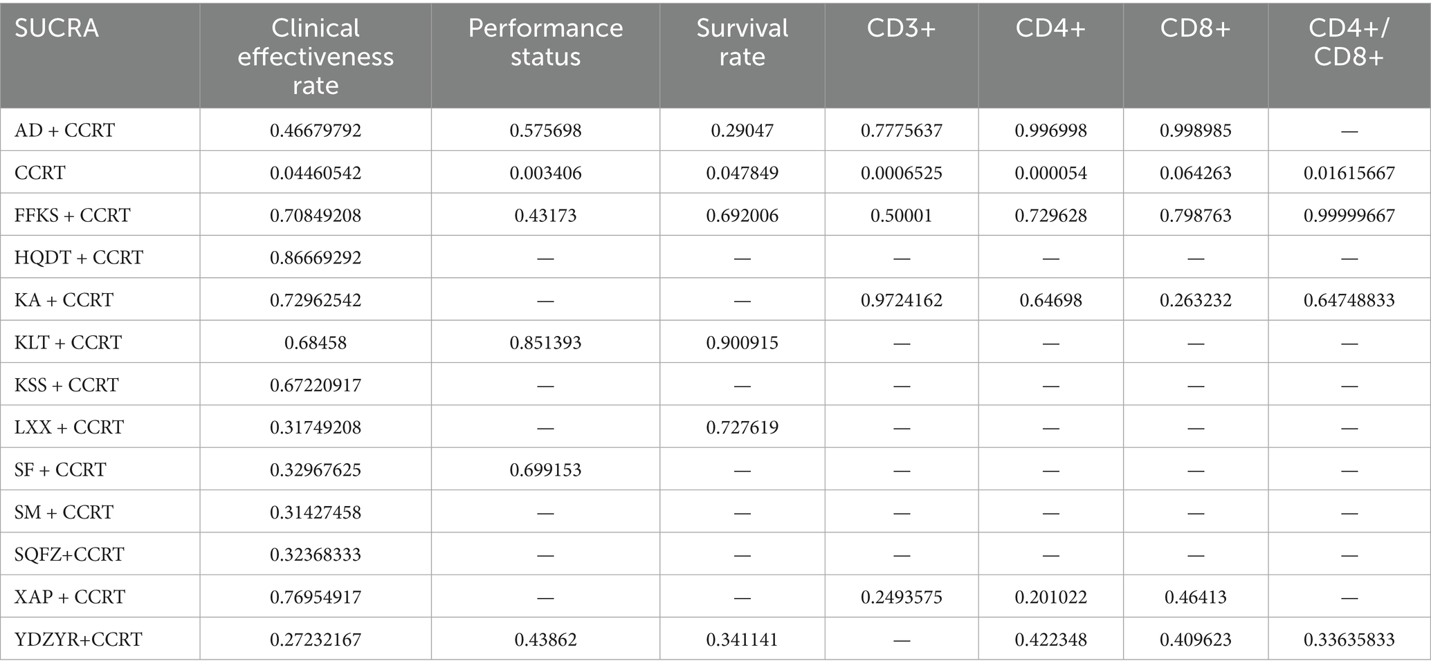 Results: 54 studies encompassing 4,201 patients and 13 types of CMIs were included. Astragalus polysaccharide injection (HQDT) combined with CCRT (SUCRA: 86.7%) ranked highest for improving clinical effectiveness rate. Kanglaite injection (KLT) combined with CCRT (SUCRA: 85.1%; 90.1%) was optimal for enhancing performance status and one-year survival rate. Kangai injection (KA) combined with CCRT (SUCRA: 97.2%) achieved the greatest improvement in CD3+ levels. Aidi injection (AD) combined with CCRT (SUCRA: 99.9, 99.9%) was most effective in increasing CD4+ and CD8+ levels, while Fufangkushen injection (FFKS) combined with CCRT (SUCRA: 99.9%) yielded the greatest improvement in the CD4+/CD8+ ratio. Based on descriptive statistics, all regimens demonstrated favorable safety profiles, with no serious adverse events (AEs) reported.