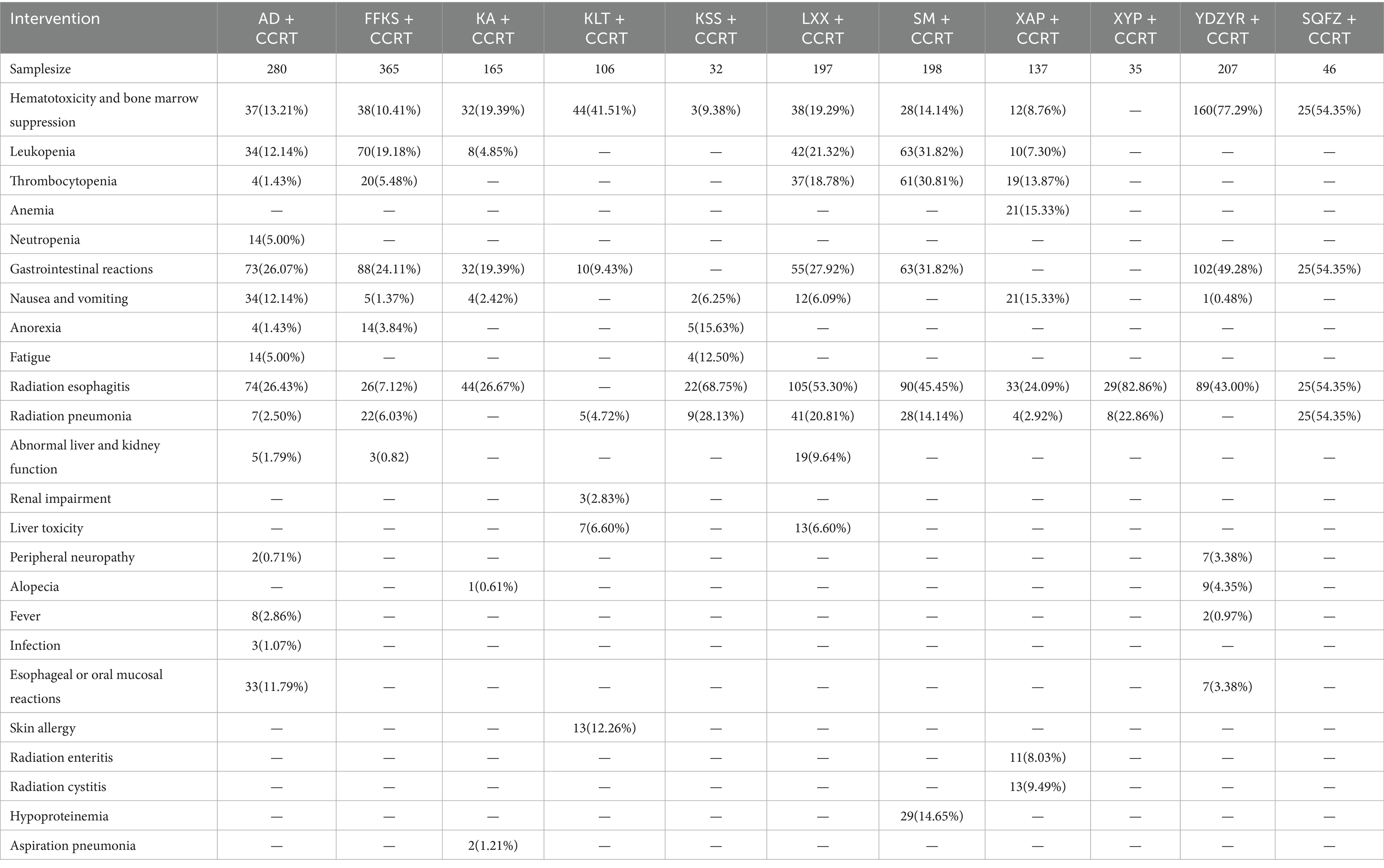 43 studies reported AEs. It should be noted that all AEs in this study were descriptively summarized, without statistical comparisons between groups; therefore, the results are intended for clinical reference only and should be interpreted with caution. Reported AEs included hematotoxicity and bone marrow suppression, leukopenia, thrombocytopenia, anemia, neutropenia, gastrointestinal reactions, nausea and vomiting, anorexia, fatigue, radiation esophagitis, radiation pneumonia, abnormal liver and kidney function, renal impairment, hepatotoxicity, peripheral neuropathy, alopecia, fever, infection, esophageal or oral mucosal reactions, cutaneous allergic reactions, radiation enteritis, radiation cystitis, hypoproteinemia, and aspiration pneumonia. Specifically, hematotoxicity and bone marrow suppression were more frequently observed in the YDZYR+CCRT group (77.29%); leukopenia and thrombocytopenia were more common in the SM + CCRT group, with incidences of 31.82 and 30.81%, respectively; gastrointestinal reactions occurred at a relatively high frequency in the YDZYR+CCRT group (49.28%); nausea and vomiting were more frequent in the XAP + CCRT group (15.33%); anorexia, fatigue, and radiation pneumonia were more common in the KSS + CCRT group, with incidences of 15.63, 12.50, and 28.13%, respectively; radiation esophagitis occurred most frequently in the XYP + CCRT group (82.86%); abnormal liver and kidney function was more frequent in the LXX + CCRT group (9.64%); alopecia and peripheral neuropathy were also observed in the YDZYR+CCRT group, with incidences of 4.35 and 3.38%, respectively; fever and esophageal or oral mucosal reactions were more common in the AD+CCRT group, with incidences of 2.86 and 11.79%, respectively. Additionally, anemia (15.33%), neutropenia (5.00%), infection (1.07%), renal impairment (2.83%), cutaneous allergic reactions (12.26%), radiation enteritis (8.03%), radiation cystitis (9.49%), hypoproteinemia (14.65%), and aspiration pneumonia (1.21%) were each reported in a single study of CMIs. The results are summarized in Table 3. Overall, descriptive data indicate variation in the incidence of AEs across treatment groups. Notably, AD+CCRT and FFKS+CCRT demonstrated comparatively lower incidences of the most common AEs, hematotoxicity and bone marrow suppression, nausea and vomiting, and radiation esophagitis, suggesting a potentially more favorable safety profile. Importantly, none of the CMIs were associated with severe AEs. Future research employing well-designed prospective studies is warranted to further validate safety differences among CMIs and elucidate the underlying mechanisms (Table 3).