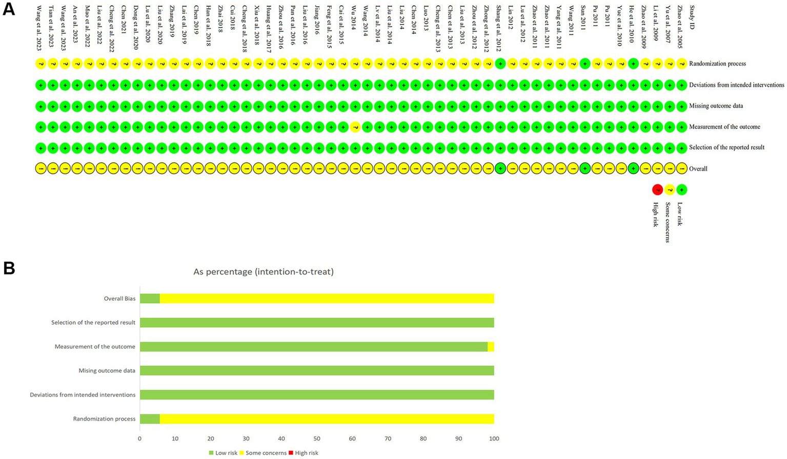 The Cochrane Risk of Bias Assessment Tool (RoB 2.0) (35) was utilized to examine the quality of studies across five domains: bias originating from randomization, resulting from deviations from the intended intervention, caused by missing outcome data, in outcome measurement, and selective reporting. For every study, two reviewers (Xi H. B., Xin Y. Q.) independently assessed each aspect, classifying biases as having a “low,” “high,” or “unclear” risk. Any disputes were settled by discussing with or consulting a third researcher (Wei F. Q.). The results were detailed in the risk of bias plot.