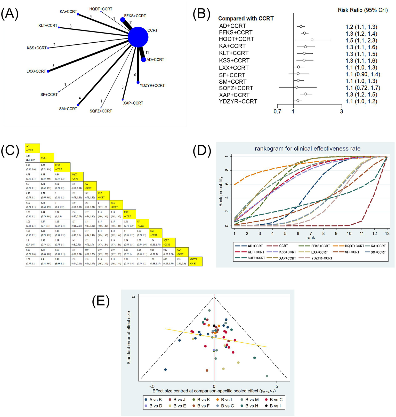 Traditional Chinese medicine (TCM) has emerged as a valuable adjunct in oncology, with demonstrated benefits in enhancing antitumor efficacy, alleviating clinical symptoms, and mitigating the toxic side effects of CCRT (18, 19). Chinese medicine injections (CMIs), an important component of TCM, ingeniously integrate TCM theories with modern pharmaceutical technology. These injections are refined by extracting active components from herbal medicines and natural products (20, 21). CMIs offer high concentrations, rapid absorption, and improved bioavailability, and have been widely applied in the treatment of non-small cell lung, breast, cervical, gastric, and colorectal cancers, among others (22–26). In TCM theory, EC falls within the category of esophageal obstruction, with a core pathogenesis involving the interlocking of phlegm and blood stasis, depletion of body fluids, and the accumulation of heat toxins—often precipitated by emotional distress and irregular diet. Early-stage EC is characterized by a sensation of obstruction on swallowing and a feeling of fullness in the chest and diaphragm, consistent with qi stagnation and phlegm accumulation. In the intermediate stage, blood stasis predominates, leading to worsening dysphagia and stabbing chest or back pain. In the late stage, patients often present with severe dysphagia to both solids and liquids, marked emaciation, and symptoms indicative of fluid depletion and internal heat accumulation. CMIs aim to regulate qi, resolve phlegm, clear heat, detoxify, and nourish qi and yin, thereby offering a promising therapeutic option for patients with EC (27). Currently, the effectiveness and safety of varied single-CMI treatments combined with chemoradiotherapy for EC have been validated (28–30). However, given the wide variety of available CMIs, comparative evidence across preparations remains insufficient, and the optimal CCRT-CMI combination for EC has not been established, posing challenges to clinical decision-making (31). Bayesian network meta-analysis (NMA) allows for the integration of direct and indirect evidence, enabling quantitative comparisons among multiple interventions and ranking their relative effectiveness and safety across diverse clinical outcomes (32). Therefore, this study aimed to employ NMA to comprehensively evaluate the efficacy and safety of different CMIs combined with CCRT in EC and offer evidence-based recommendations to guide clinical decision-making.