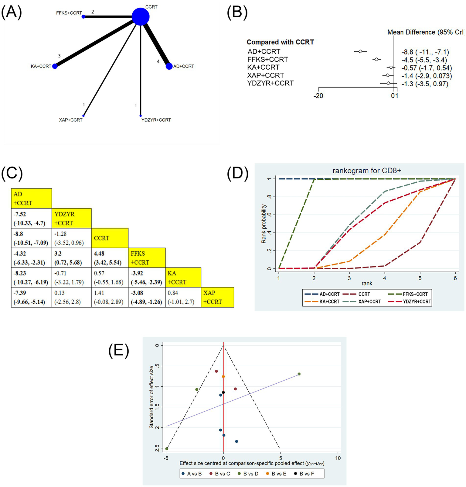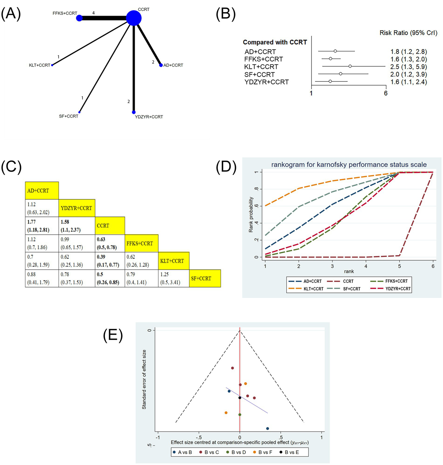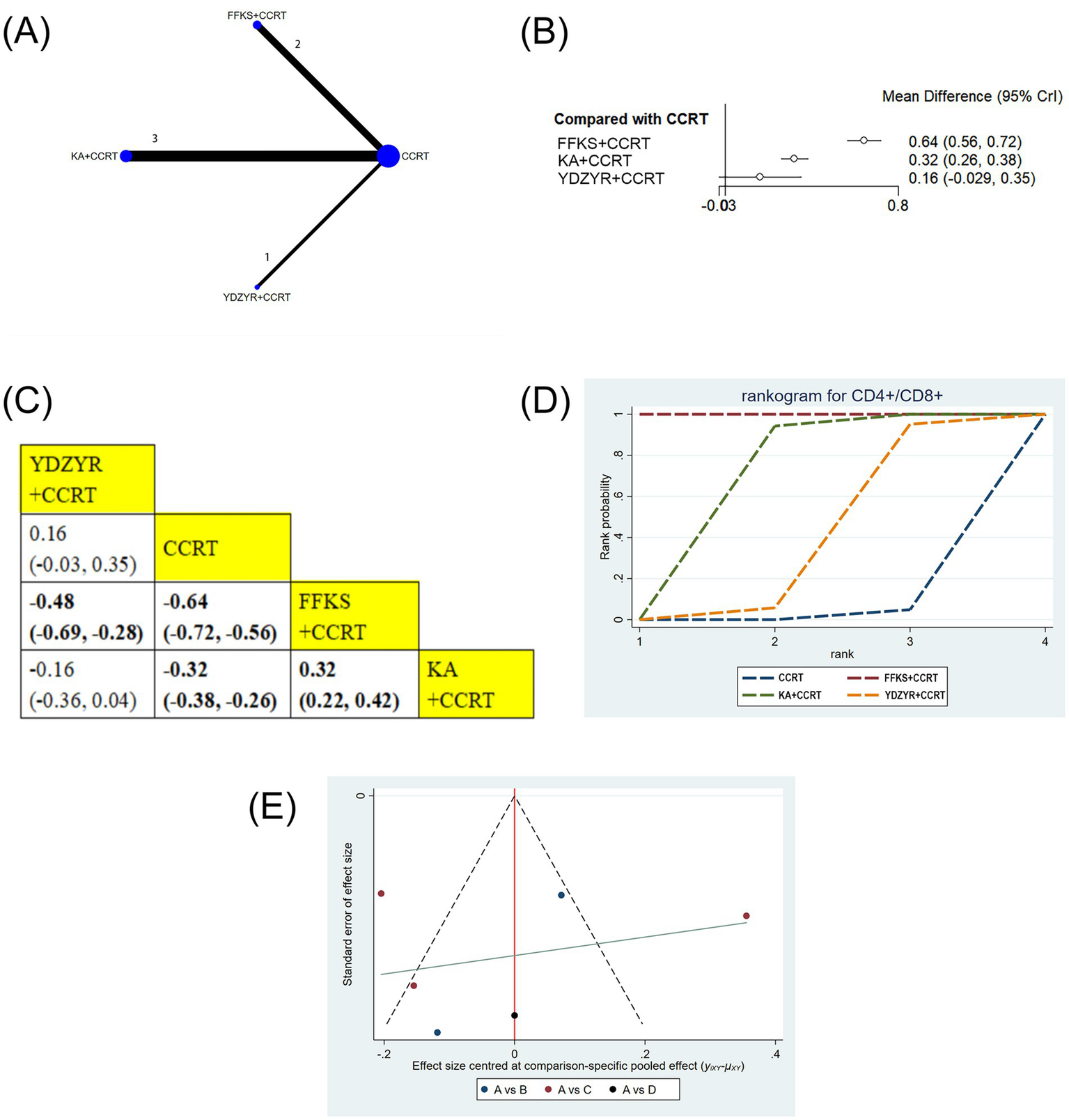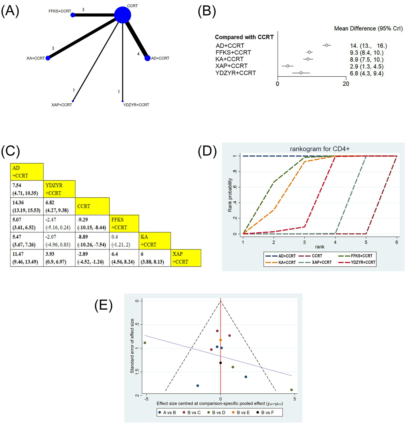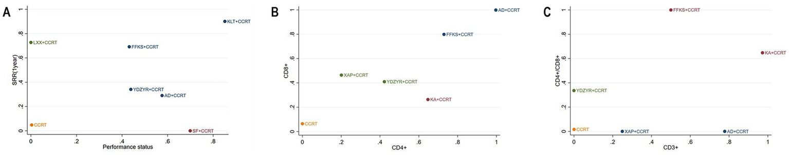 The risk ratio (RR) with 95% confidence interval (CI) was utilized to quantify the clinical effectiveness rate, performance status, and one-year survival rate. Weighted mean differences (MD) with 95% CIs were used to show the rates of CD4+/CD8+, CD3+, CD4+, and CD8+. The Bayesian hierarchical random-effects model was initially fitted for comparisons of various EC treatment options due to the heterogeneity among trials (36, 37). R 4.2.1 and Stata 15.1 were utilized to generate all computations and graphics. To examine the posterior distributions of the questioned nodes, a Markov chain Monte Carlo (MCMC) simulation was conducted using Bayesian inference via R, with 500,000 iterations and 20,000 annealings, based on the theory of the likelihood function and certain presumptions (38–40). Overall model consistency was evaluated using the Deviance Information Criterion (DIC); a difference of <5 between the DIC values of the consistency and inconsistency models was interpreted as indicating satisfactory overall consistency. Convergence was assessed via the potential scale reduction factor (PSRF), with values in the range of 1.00 to <1.05 denoting adequate convergence. For outcomes involving closed loops, local inconsistency was examined using the node-splitting method. A network diagram was constructed to visualize the relationships among treatments, and publication bias was assessed using a comparison-adjusted funnel plot combined with Egger’s test (41, 42). Therapeutic ranking was determined according to the surface under the cumulative ranking curve (SUCRA), with values ranging from 0 to 1; higher SUCRA values indicated a superior ranking of EC relative to other interventions (43, 44). A league table displayed the comparative results of each pair of interventions for every outcome.