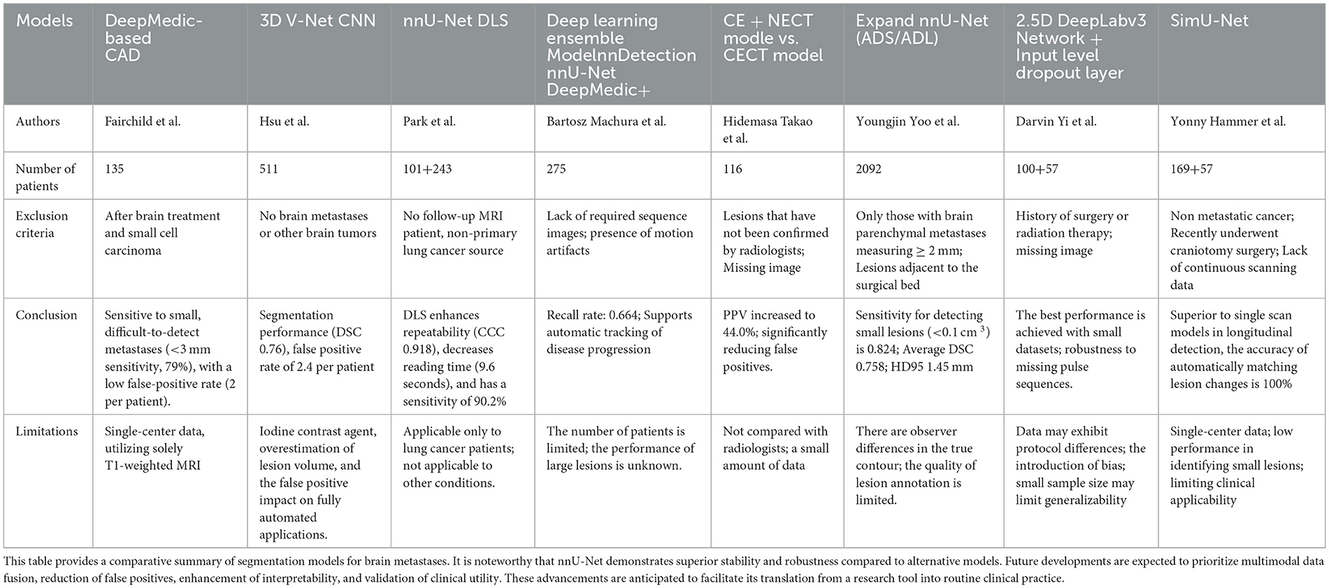 Among brain tumors, brain metastases (BM) are recognized as one of the most aggressive entities. Their pronounced morphological heterogeneity, however, complicates clinical efforts to optimize treatment dosing and intensity. Early subtype differentiation of BM can facilitate more tailored therapeutic strategies, thereby improving disease control and helping preserve functional brain tissue (25). Rapid advances in AI-driven BM segmentation have enabled classification algorithms based on segmentation network architectures to enhance patient stratification and significantly reduce diagnostic and therapeutic timelines (26).