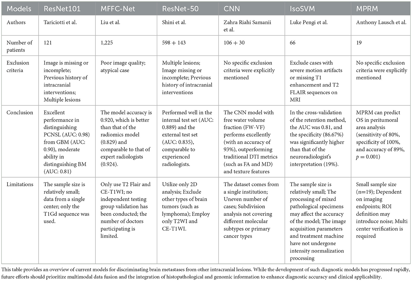 AI enables high-sensitivity analysis of MRI, CT, and other imaging modalities. It can accurately detect millimeter-scale lesions and extract subtle imaging features—such as ill-defined lesion margins, heterogeneity in enhancement patterns, and perilesional edema distribution—that are challenging to discern with the human eye. These capabilities significantly enhance the ability of radiologists to differentiate between primary gliomas, brain metastases, and other intracranial pathologies. A summary of the relevant research is provided in Table 2.