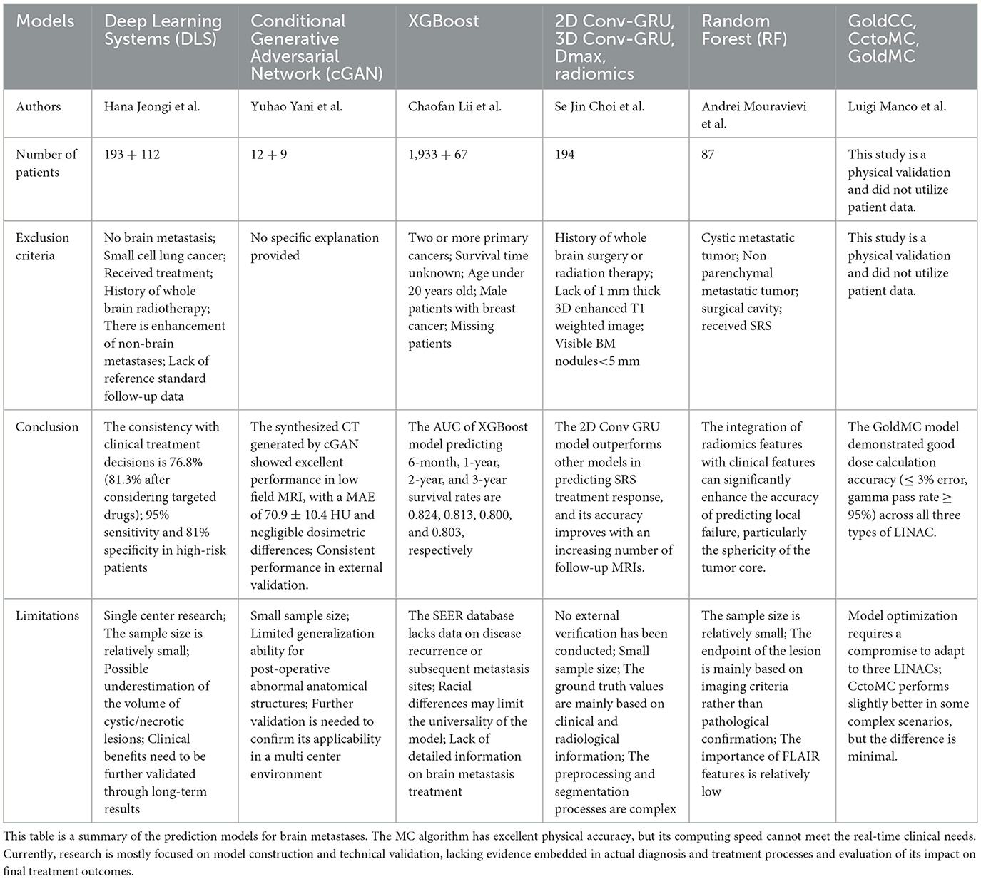 30. Cho SJ, Cho W, Choi D, Sim G, Jeong SY, Baik SH, et al. Prediction of treatment response after stereotactic radiosurgery of brain metastasis using deep learning and radiomics on longitudinal MRI data. Sci Rep. (2024) 14:11085. doi: 10.1038/s41598-024-60781-5