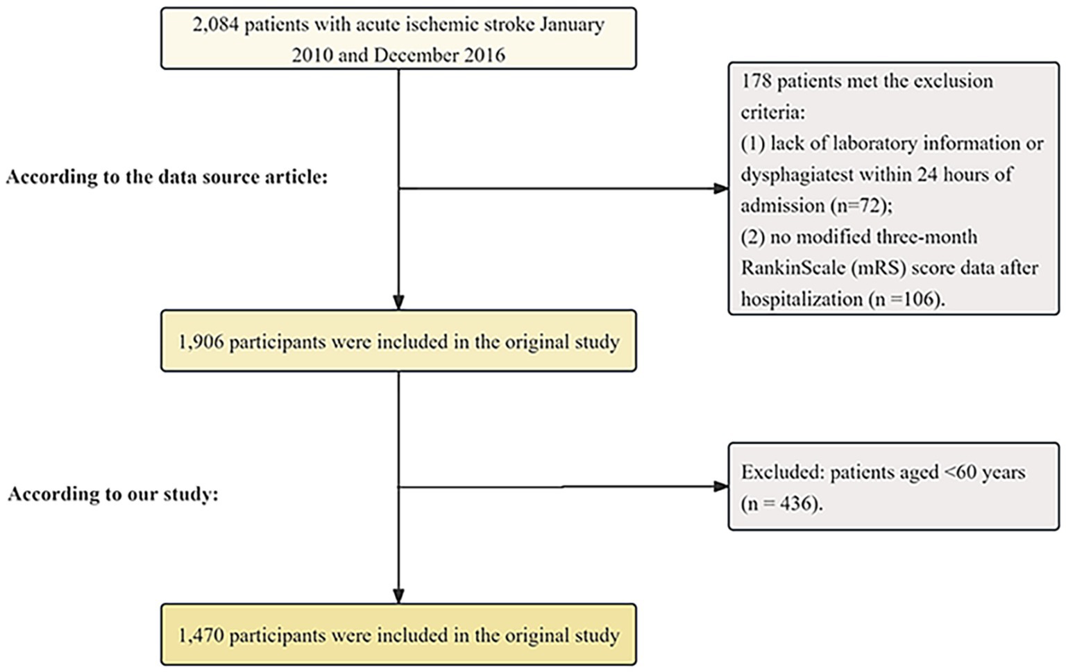 The study analyzed data from a prospective registry system at Seoul National University Hospital, collected between January 2010 and December 2016 (15). Initially, 2,084 patients with AIS admitted within 7 days of symptom onset were identified through a prospective registry. The exclusion criteria included missing laboratory or dysphagia screening data within 24 h of admission (n = 72) and the absence of three-month mRS scores after discharge (n = 106). Patients younger than 60 years (n = 436) were also excluded. After applying these criteria, a total of 1,470 patients were included in the final analysis (Figure 1).