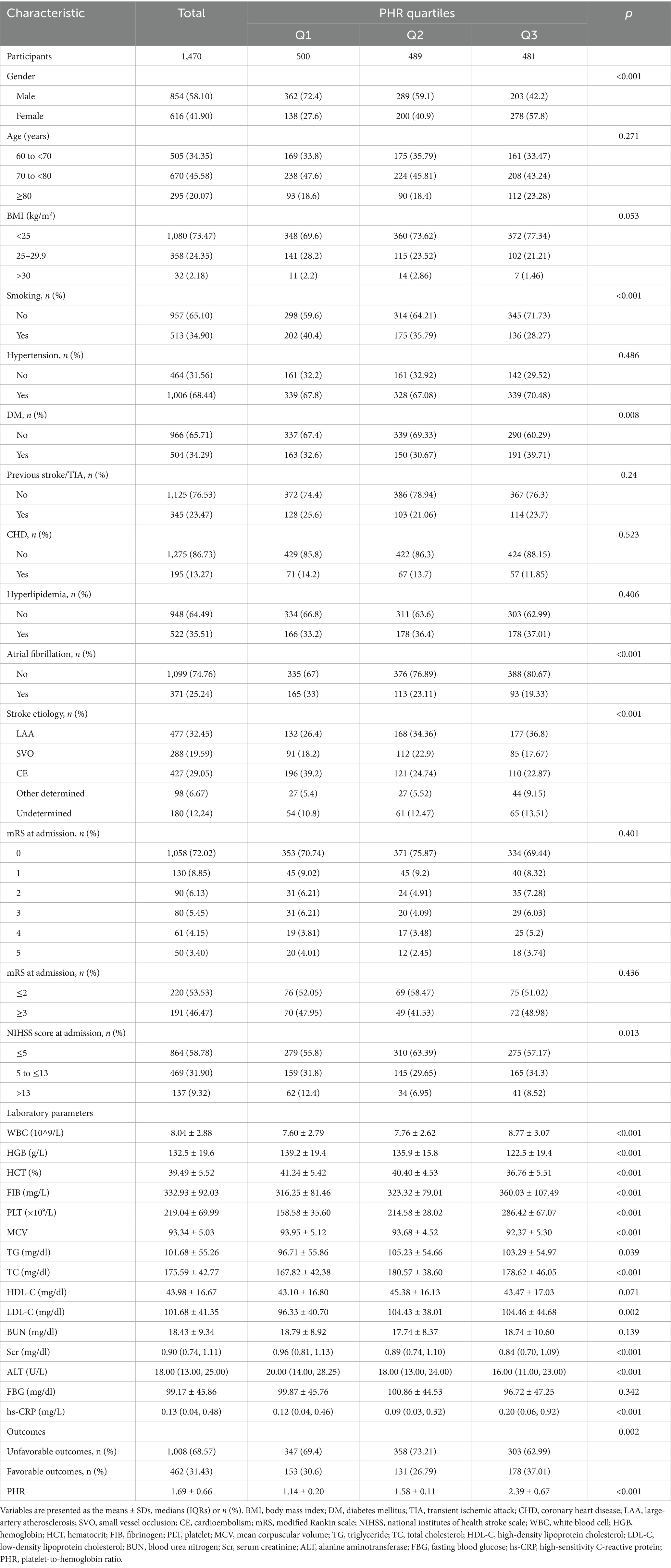 In this study, 1,470 older patients with AIS were enrolled and categorized into tertiles on the basis of PHR levels. With increasing PHR, the proportions of female patients and those with DM significantly increased, whereas the prevalence of smoking and AF decreased. The distribution of stroke subtypes also differed significantly across PHR tertiles (all p < 0.001) (Table 1). Among the 462 patients with unfavorable outcomes at 3 months (n = 462), female, age ≥ 80 years, BMI > 30 kg/m2, smoking history, hypertension, DM, previous stroke or TIA, AF, and higher baseline scores on both the mRS and the NIHSS were all significantly more prevalent (all p < 0.05). Laboratory parameters, including WBC, fibrinogen, and hs-CRP, were significantly elevated in the unfavorable outcome group (all p < 0.001), and the PHR was also significantly greater than that in the favorable outcome group (1.78 ± 0.81 vs. 1.66 ± 0.57, p = 0.001) (Supplementary Table S3). Univariate logistic regression analysis demonstrated that female sex, age ≥80 years, DM, prior stroke or TIA, AF, higher NIHSS scores, and elevated levels of fibrinogen and hs-CRP were significantly associated with an increased risk of unfavorable outcomes (Supplementary Table S4).