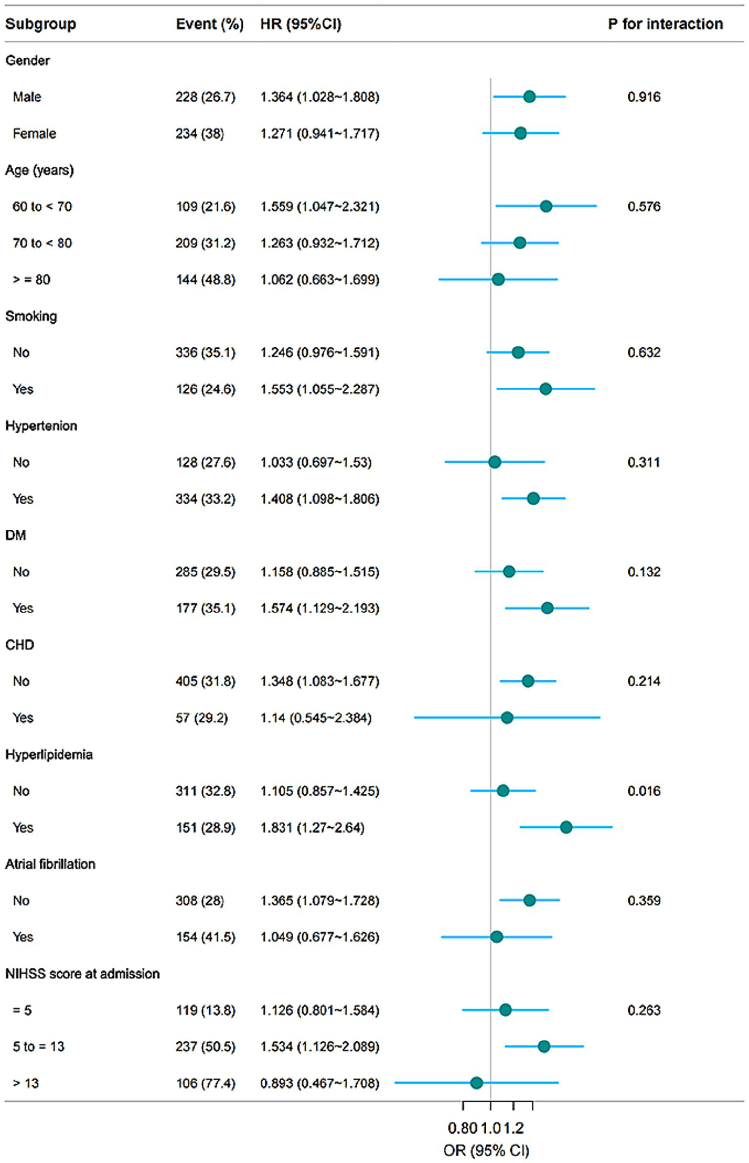To further assess the robustness of our findings, we conducted sensitivity analyses, including subgroup analyses stratified by gender, age, BMI, smoking status, hypertension, DM, CHD, hyperlipidemia, AF, and NIHSS score at admission, to evaluate whether the associations between the PHR and adverse outcomes in patients with AIS remained consistent across different clinical subgroups. In addition, E values were calculated to estimate the minimum strength of association that an unmeasured confounder would need to have with both PHR and adverse outcomes to fully explain the observed associations via the formula E = RR + sqrt[RR × (RR − 1)] (17).