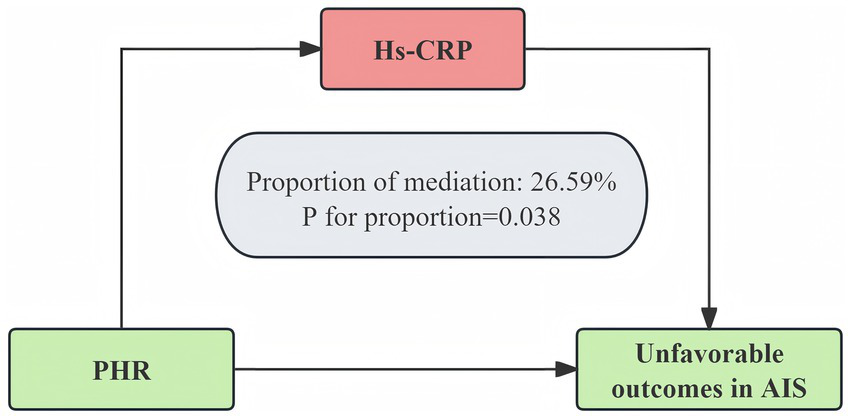 Therefore, this study aimed to investigate the associations between PHR and 3-month functional outcomes in a large cohort of older patients with AIS. In addition, we investigated whether high-sensitivity C-reactive protein (hs-CRP), a well-established marker of systemic inflammation (14), mediates this association, with the aim of elucidating potential biological pathways linking the PHR to stroke prognosis.