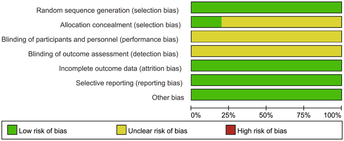 The methodological quality of all included studies was rigorously evaluated using the Cochrane Library’s quality assessment criteria (14). These criteria comprise seven core domains: adequacy of random sequence generation, effectiveness of allocation concealment, implementation of blinding for participants and intervention providers, application of blinding for outcome assessors, completeness of outcome data, presence of selective reporting, and identification of other potential sources of bias. For each domain, a judgment of “low risk of bias, ““high risk of bias,” or “unclear risk of bias” was assigned based on the degree of adherence to methodological standards.