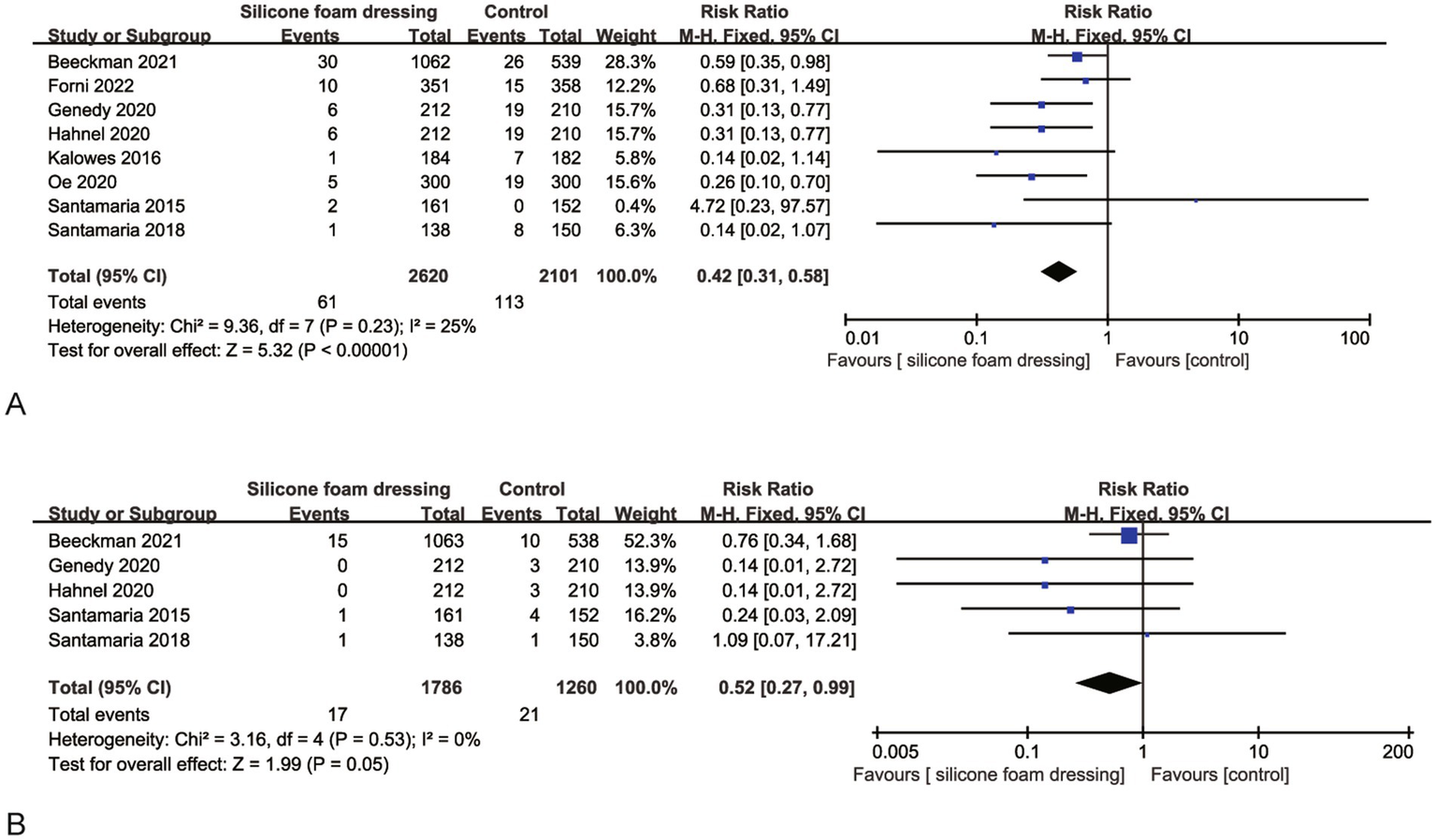 Figure 5. Forest plots of the efficacy of silicone foam dressings in preventing stage II and more severe pressure injuries in the sacral or heel area of patients. (A) Forest plot of the efficacy of silicone foam dressings in preventing stage II and more severe pressure injuries in the sacral area of patients. (B) Forest plot of the efficacy of silicone foam dressings in preventing stage II and more severe pressure injuries in the heel area of patients.