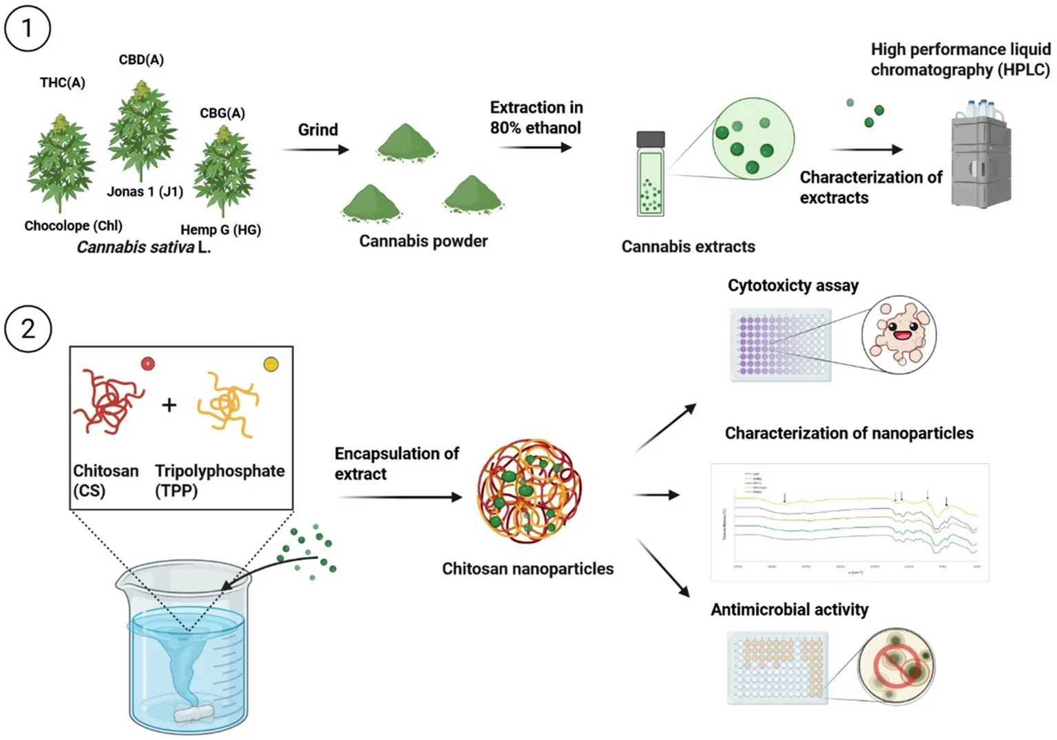 This study aimed to prepare and characterize chitosan nanoparticles (NP) containing extracts from three cannabis chemovars, evaluate and compare the antimicrobial activity of pure and encapsulated extracts against bacteria and fungi, and determine the cytotoxic effects of (non)encapsulated extracts on human skin cells.