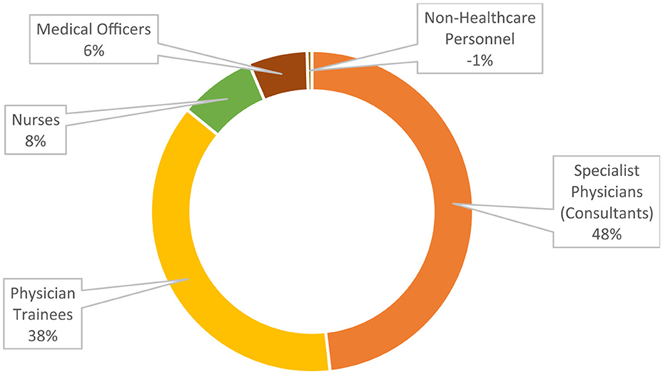 Majority of the participants were specialist physicians (106, 48.2%) and physician trainees (83, 37.7%) (Figure 1). The participants included several physician specialties, nurses and others (Table 2).