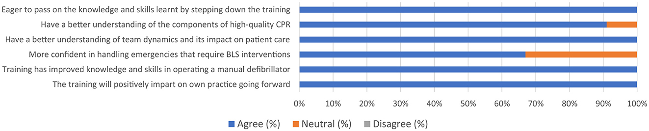 The training evaluation was based on the structure of the AHA BLS training protocol. No pre-test was done. Following training, a multiple-choice post test and skills tests were administered to the participants. A pass mark of 84% in the post test, and 100% in the skills tests were required to be certified as BLS provider. In addition, a qualitative feedback survey, using a 5-point Likert scale, was administered to the participants to ascertain their self-perception of their skills and the training programme.