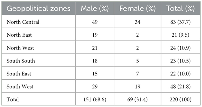 There were 151 (68.6%) male and 69 (31.4%) female participants across the 6 geopolitical zones (Table 1).