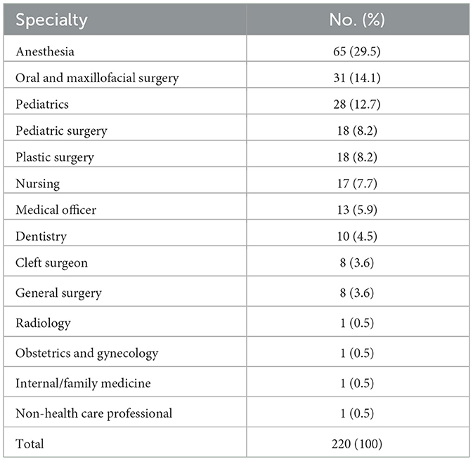 The target participants were healthcare professionals including nurses, trainee physicians and specialist physicians. Participants were selected from specialized cleft lip and palate treatment centers and public tertiary hospitals. The selection was based on their involvement in cleft care and surgical care. The cleft care centers were included as part of a strategy of aligning with funder priorities to achieve broader health system strengthening goals and contributed only 3.6% of the participants. The public tertiary hospitals are multispecialty and offer cleft care as a component of the many specialized services they provide thereby contributing significantly to the broader emergency and surgical preparedness landscape.