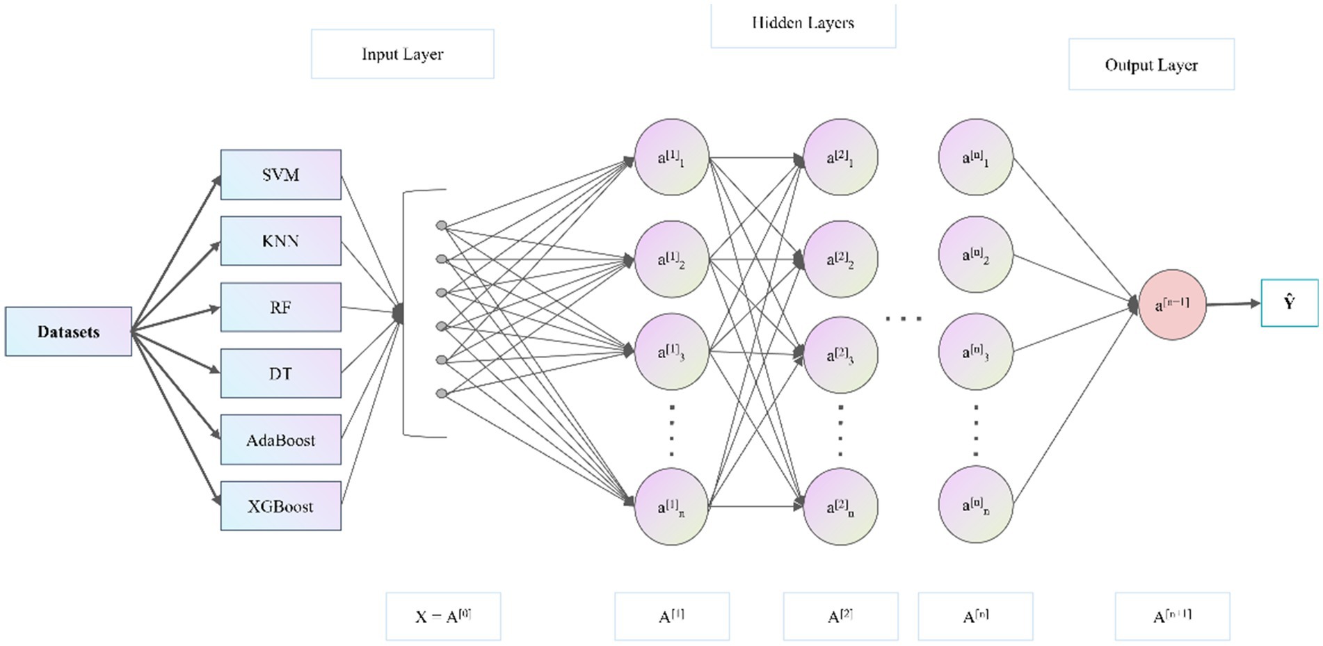 All training processes were carried out in Python 3.11. The specific method framework is shown in Figure 1, which shows the hierarchical structure and information transmission process of the StackANN model. In order to optimize the model performance, we optimized the hidden layer structure, learning rate, maximum number of iterations and other hyperparameters during the setting process. The detailed hyperparameters are listed in Table 2. Here, Hidden Layer Sizes refers to the number of neurons in each hidden layer, reflecting the network architecture; Max Iterations is the maximum number of weight update iterations during training; Alpha is the L2 regularization parameter, used to prevent overfitting; Learning Rate Init represents the initial step size of the learning rate at the start of training. To ensure the reproducibility of experimental results, we fixed the random seed throughout the entire experimental workflow: the global random seed was set to 3,407 to control all major random processes (including SMOTE oversampling and model initialization); the data splitting process random seed was set to 42 to ensure consistent training-test splits. This two-level seeding strategy guarantees complete reproducibility of results while adhering to best practices in experimental design.