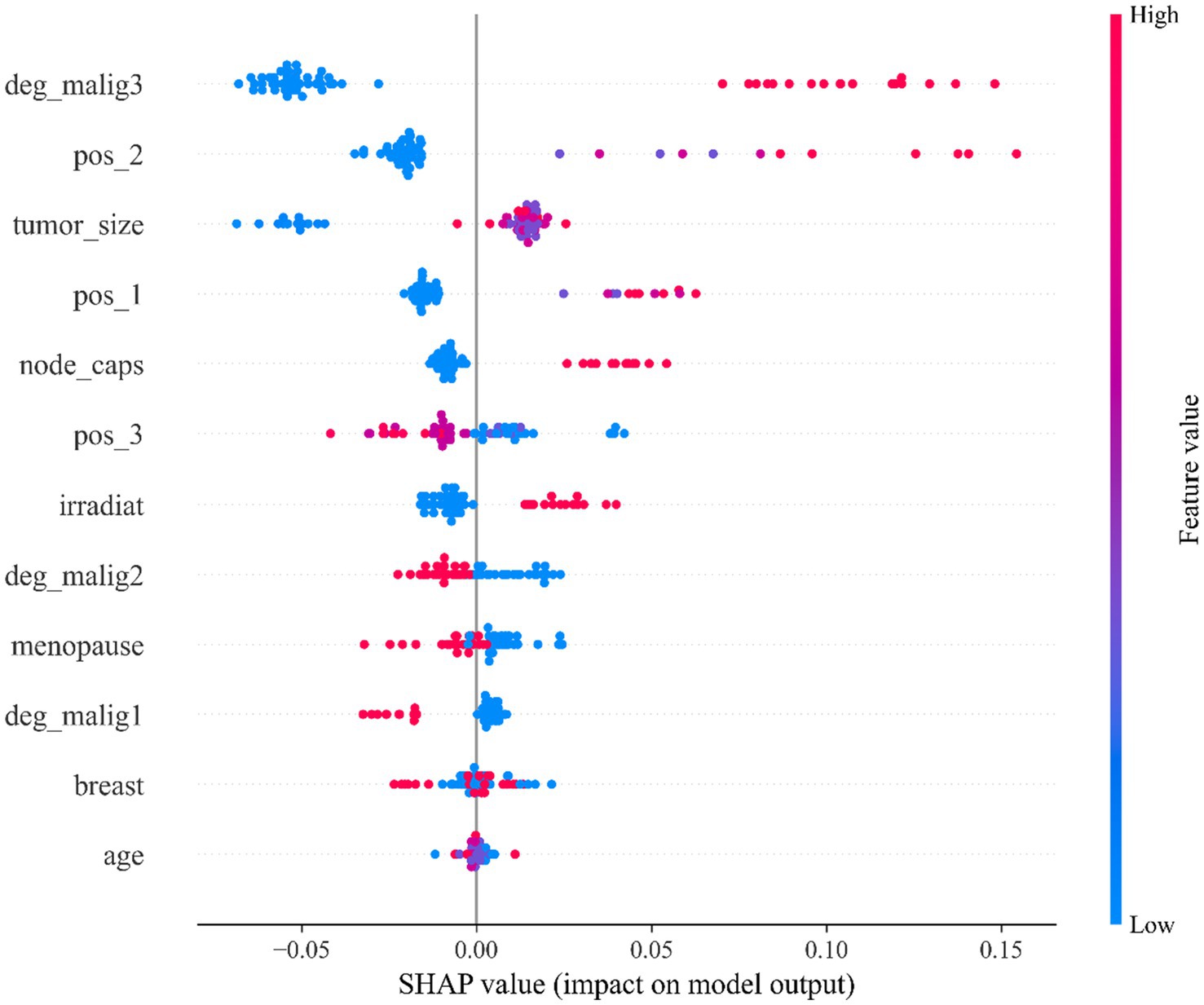 As can be observed from Figure 4, in the LBC dataset, the model mainly relies on clinical features such as tumor malignancy, location, and size for prediction. Specifically, feature deg_malig3 (malignancy level 3) is the feature with the greatest impact on the model output, followed by feature pos_2 (position 2) and feature tumor_size (tumor size), while demographic features such as age and breast location have relatively small impacts. The points of top features such as deg_malig3, pos_2, and tumor_size are widely distributed, indicating that they have significant effects on different samples to varying degrees. Feature deg_malig3 represents the highest level in histological grading. Grade 3 represents the most poorly differentiated and most malignant tumor, reflecting the high degree of atypia and poor differentiation of tumor cells. Clinically, it usually represents the most aggressive and worst prognostic pathological type (45). Therefore, it plays a decisive role in the prediction model. The feature pos_2 reveals the specific location of the tumor in the breast, which affects its prognosis and malignancy. The feature tumor_size is a key indicator to measure the growth potential of the tumor, which directly affects the malignancy and prediction results. In summary, the model mainly relies on the biological behavior characteristics of the tumor for prediction, especially key factors such as histological grade, tumor location and size.