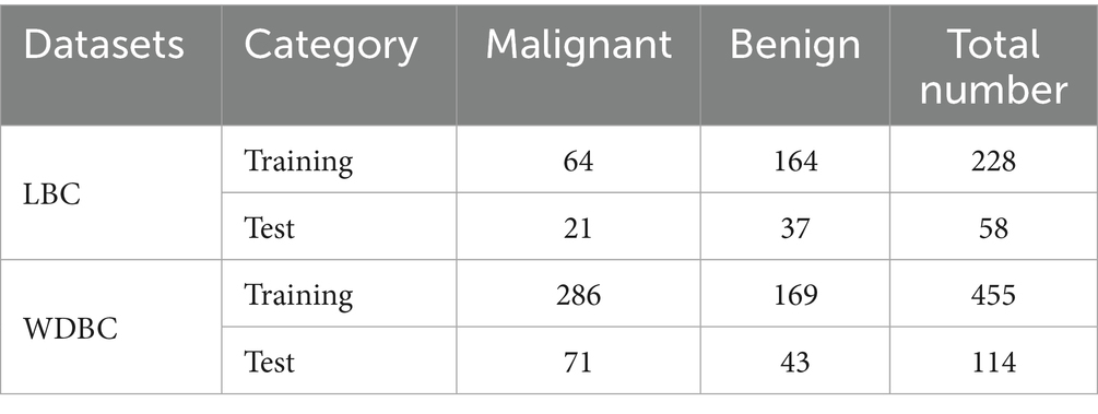 The LBC Dataset was provided by the Institute of Oncology, University Medical Center, Ljubljana, Yugoslavia (19). This dataset contains clinical sample information from 286 breast cancer patients. Each sample contains 9 clinical features related to breast cancer prognosis (such as tumor size, lymph node capsule, etc.) and a label that identifies the sample category (0 for benign and 1 for malignant). Among them, there are 201 benign samples and 85 malignant recurrence samples. In this paper, we performed necessary data preprocessing on the LBC Dataset. The detailed process of data preprocessing is shown in the supporting materials.
