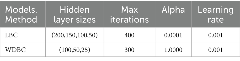 In order to verify the generalization performance of the model, we selected the WBCD dataset. The WBCD dataset is a dataset commonly used in breast cancer classification research (21). It contains 699 breast cancer samples from the University of Wisconsin Medical Center, of which 458 samples are benign (0) and 241 samples are malignant (1). Each sample consists of 9 features and 1 label. The features are obtained through fine FNA and mainly describe the morphological characteristics of tumor cell nuclei, including radius, texture, smoothness, perimeter, area, etc. To ensure data quality, samples containing missing values were removed, and the final dataset contains 683 valid samples. We use this dataset as an external validation set.