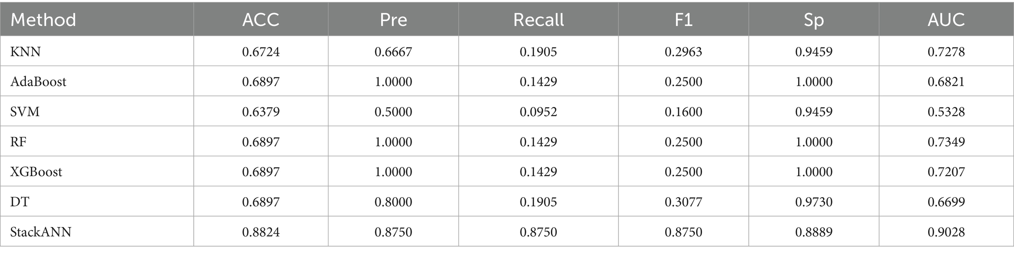 The stacking method is a special ensemble learning method (31). The performance of a single model under different data distributions may be unstable, and the stacking method can effectively make up for the limitations of a single model by integrating the prediction results of multiple models (32).