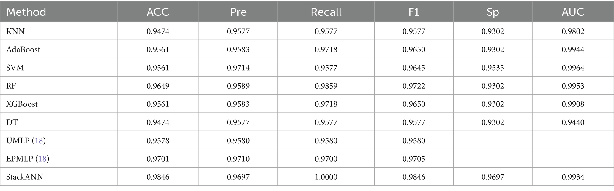 Compared to traditional machine learning models, the StackANN ensemble model demonstrates comprehensive superiority. Both KNN and DT exhibit significantly lower Recall and F1 scores than StackANN. Although AdaBoost, XGBoost, and SVM perform similarly in terms of Pre, their Recall remains below 1.0000, indicating a risk of missed diagnoses. While Random Forest (RF) achieves a relatively high Recall (0.9859), its overall F1 score and Recall still fall short of StackANN. Compared with recently proposed hybrid and deep learning models, StackANN demonstrates superior overall performance in terms of ACC and F1. Specifically, StackANN achieves an ACC of 0.9846, significantly higher than UMLP (0.9578), and EPMLP (0.9701). In terms of F1, StackANN (0.9846) also outperforms UMLP (0.9580) and EPMLP (0.9705). Importantly, StackANN achieves a perfect Recall of 1.0000 while maintaining high ACC, indicating that the model can comprehensively identify all malignant samples, thereby substantially reducing the risk of missed diagnoses in clinical settings. In addition, the close alignment between its ACC and F1 indicates an optimal balance between Pre and Recall, a critical characteristic in medical diagnostic scenarios where both false positives and false negatives have significant clinical implications. These results fully demonstrate that StackANN possesses stronger generalization capability and stability. The specific evaluation indicators of each model are shown in Table 4.