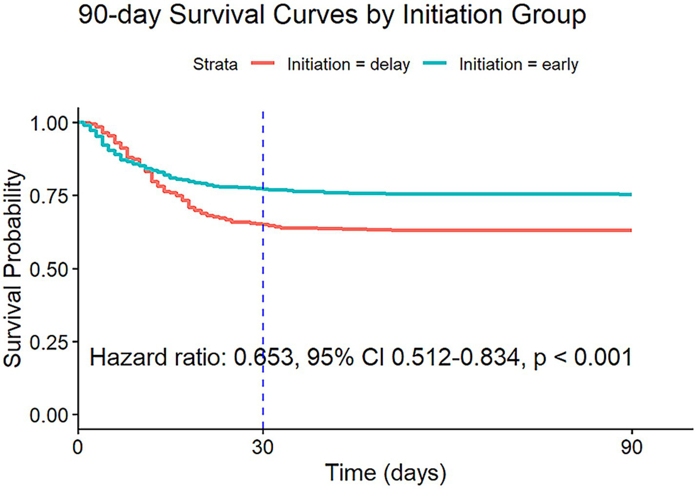After estimating the propensity score, stable inverse probability weights (IPW) were calculated to adjust for confounders. Additionally, in this population, 90-day mortality was subsequently assessed using a weighted Cox model to determine the distribution from time to event. The model also included systolic blood pressure, mean arterial pressure, temperature, pH, bicarbonate, lactate, hemoglobin, blood urea nitrogen, and creatinine levels, as these values could have an independent effect on mortality regardless of the patient’s decision to start RRT (35, 36). Hazard ratios (HR) are presented as the mean treatment effect for the study. Survival curves were constructed using a stratified Cox model, and Cox models with IPW were applied to evaluate 90-day mortality, focusing on the timing of event occurrence (see Supplementary materials).