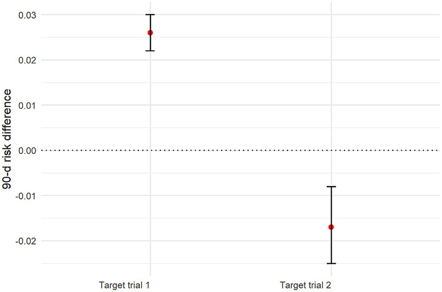 In contrast to conventional observational studies, this study adopts the target trial emulation framework (20, 21), which rigorously defines treatment strategies, specifically distinguishing between early and delayed RRT initiation. The framework also emulates dynamic treatment allocation through the cloning method and resolves time-varying confounding via doubly robust estimation using the augmented inverse probability weighting (AIPW). We further employed inverse probability weighted Cox proportional hazards models and accelerated failure time (AFT) models to address potential survival analysis biases (22, 23). Traditional observational studies often rely on Cox regression or propensity score matching, which inadequately address immortal time bias and time-varying confounding. For instance, Hernán (20) demonstrated that conventional approaches erroneously incorporate post-treatment covariates into models, thereby introducing bias. By emulating the intention-to-treat principle of target trials through a cloning-censoring-weighting structure, this study integrates both propensity score and outcome models with AIPW, thereby producing more reliable estimates of causal effect.