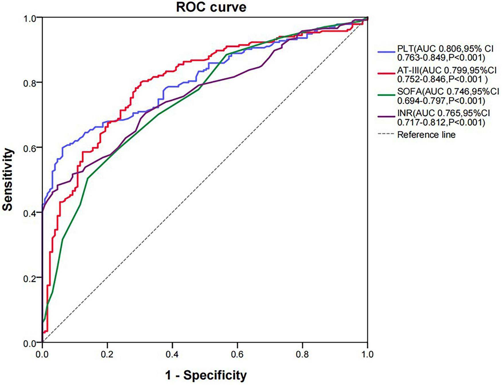 In this study, the results of AT-III activity in the SIC group were significantly lower than those in the non-SIC group (44.40 vs. 67.60%, respectively; P < 0.001) (Figure 1B). Therefore, we used ROC curve analysis to evaluate the value of AT-III in the diagnosis of SIC. The current diagnostic indicators for SIC include SOFA score, INR, and platelet count. To evaluate the diagnostic efficacy of AT-III activity, we compared its ROC curve area under the curve (AUC) with that of SOFA score, INR, and platelet count. Since the higher the SOFA score and INR, the greater the possibility of diagnosing SIC, which is different from the trend of changes in platelet count and AT-III activity, we performed reciprocal processing on SOFA score and INR in the ROC curve analysis. The results showed that the AUC for AT-III activity was 0.799 (P < 0.001), the AUC for platelets was 0.806 (P < 0.001), the AUC for SOFA score was 0.746 (P < 0.001), and the AUC for INR was 0.765 (P < 0.001) (Figure 2). An AUC of 70–90% indicates good accuracy of diagnostic and evaluation results, so AT-III activity has good accuracy in diagnosing SIC. The results of the DeLong Test showed that the AUC for AT-III activity in diagnosing SIC had no statistically significant difference compared with the AUCs of the traditional diagnostic indicators (8), including platelets, SOFA score, and INR (P = 0.928, P = 0.104, and P = 0.211, respectively) (Supplementary Table 2).