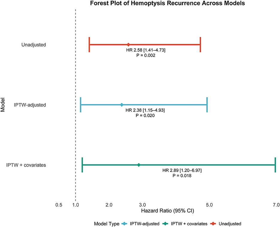 Figure 4. Forest plot depicting hazard ratios with 95% confidence intervals and associated p-values for recurrent hemoptysis in patients with cystic bronchiectasis across multiple statistical models. HR, hazard ratio; CI, confidence interval; IPTW, inverse probability of treatment weighting.