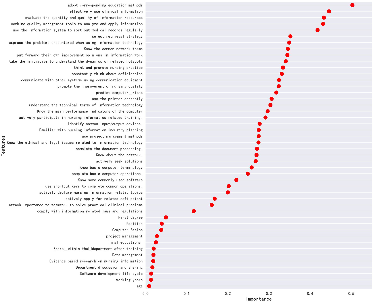 The 1,237 participants in this study were recruited exclusively from a single tertiary Grade A general hospital in Zhejiang Province. Additionally, the hospital’s unique institutional informatization management model may overstate the competence level of the participants, thereby reducing the external validity of the study. Second, although 8 competence-related variables were identified through mutual information correlation analysis, the underlying mechanisms were not explored. This not only prevents the establishment of a causal relationship between these factors and competence but also fails to capture temporal changes in competence, thus limiting the evidence for the long-term effectiveness of interventions. Furthermore, no in-depth subgroup analysis was conducted for nurses with different job roles, educational backgrounds, or work experience. This makes it impossible to clarify the specific effects of these 8 factors on different subgroups, thereby reducing the practical applicability of the training recommendations proposed in the study.