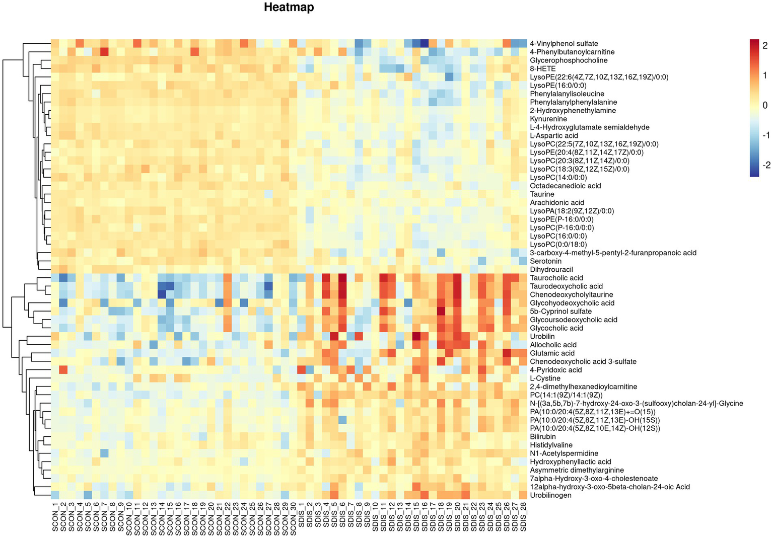Heat map of metabolite expression in serum of patients with cirrhosis.