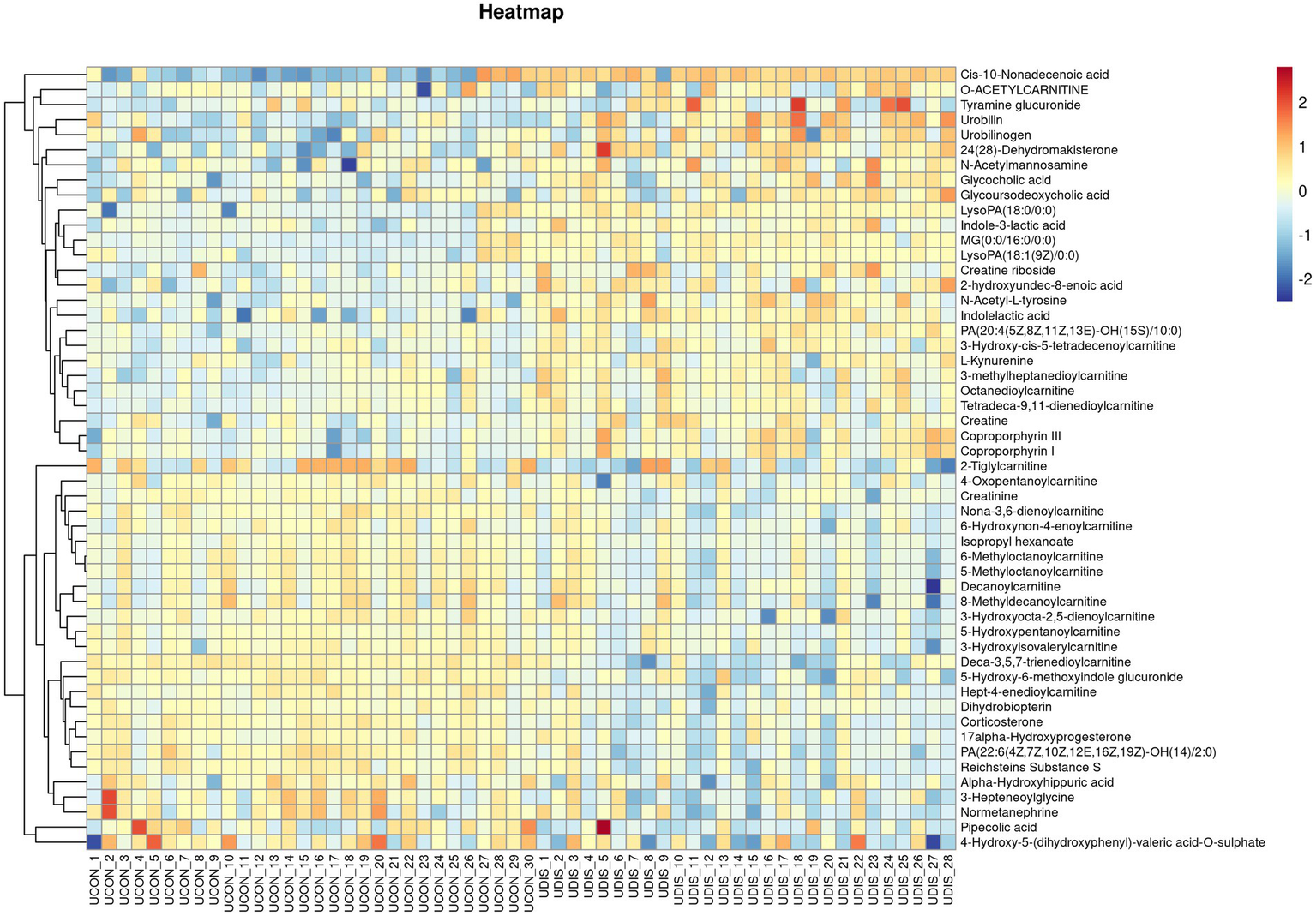 Heat map of metabolite expression in urine of patients with cirrhosis.