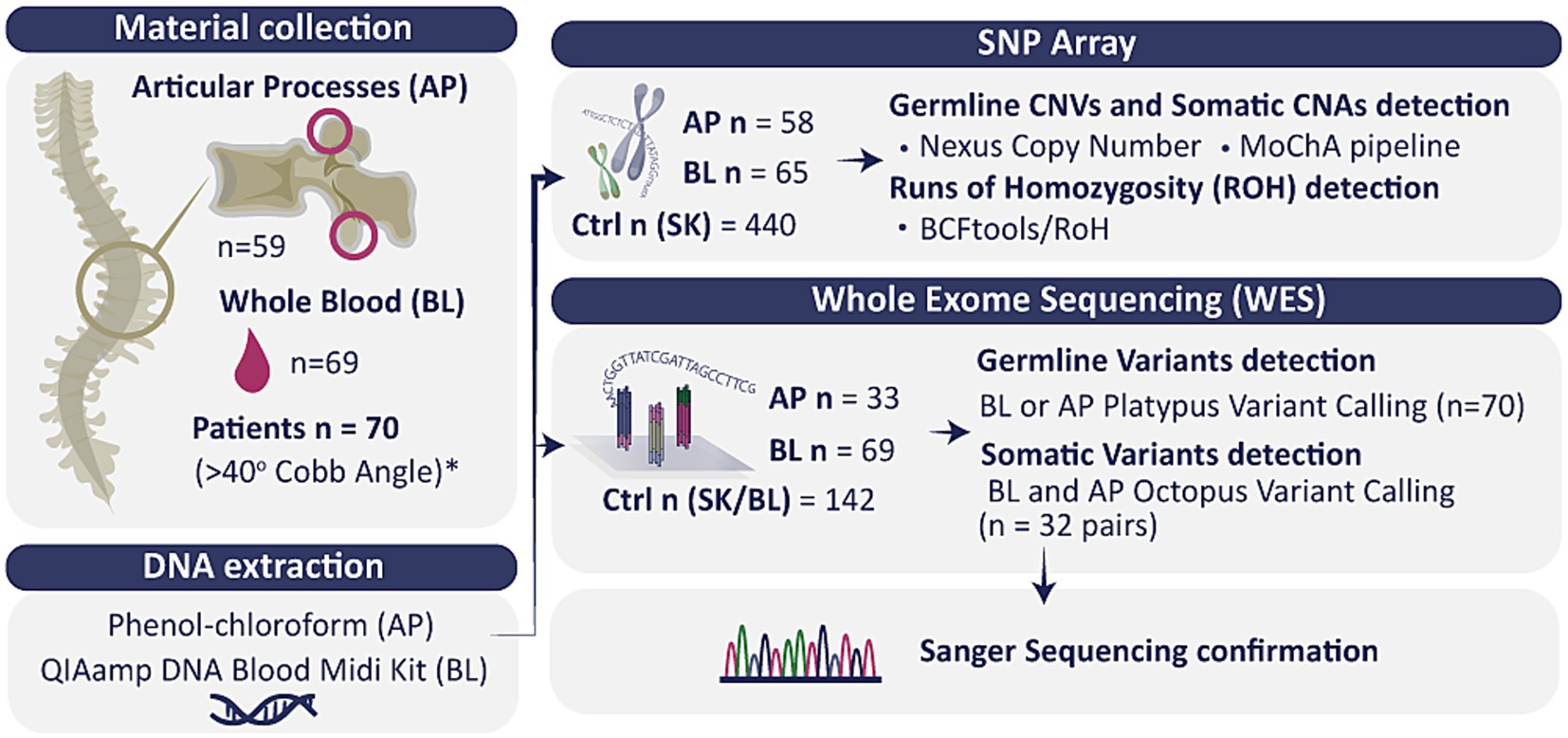 Figure 1. Visual representation of the study workflow. AP, articular processes; BL, whole blood; SK, skin; Ctrl, control; CNVs, copy number variations; CNAs, copy number alterations; ROH, runs of homozygosity, *or smaller if clinically justified surgery qualification.