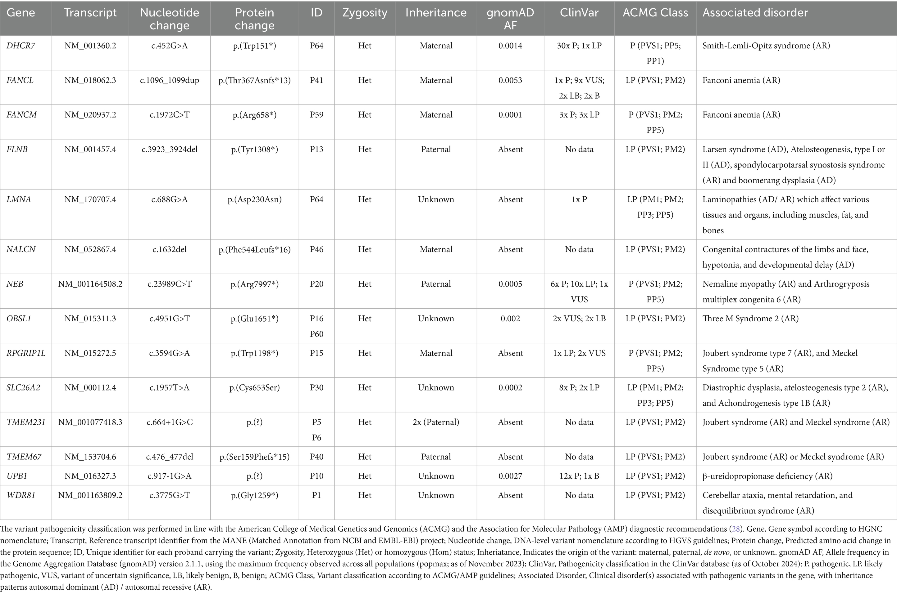 We identified here a total of 45 variants in 38 individuals, including 17 truncating variants found in 30% (21/70) of individuals and 28 non-truncating variants in 34.3% (24/70) of cases (Supplementary Table 4). Of these variants, 12 distinct and two recurrent heterozygous variants in 14 genes, present in 16 individuals, were classified as pathogenic or likely pathogenic according to current diagnostic recommendations (Table 1) (28). These included seven nonsense variants in the DHCR7, FANCM, FLNB, NEB, OBSL1, RPGRIP1L, and WDR81 genes; three frameshifts variants in FANCL, NALCN, and TMEM67; two missense variants in LMNA and SLC26A2; and two splicing variants in TMEM231 and UPB1. All 14 variants were either rare (“popmax” < 0.005) or had not been reported in the gnomAD database. Constitutional variants in the FLNB, LMNA, and NALCN genes have previously been associated with autosomal dominant (AD) disorders, such as Larsen syndrome, Laminopathies, Familial partial lipodystrophy, and Congenital contractures of the limbs, face, hypotonia, and developmental delay, which present clinically with scoliosis or other skeletal abnormalities (29–32). Among the genes specifically associated with IS, recurrent pathogenic, likely pathogenic, or VUS heterozygous variants were identified in A2ML1, ERCC2, MYH7, FLNB, RYR1, and TMEM231 (Supplementary Table 4), with FLNB reaching statistical significance in Fisher’s exact test compared to the control group (p-value = 0.035). Statistical tests were performed based on the number of identified pathogenic variants in the studied group compared to the control group, counting occurrences per gene.