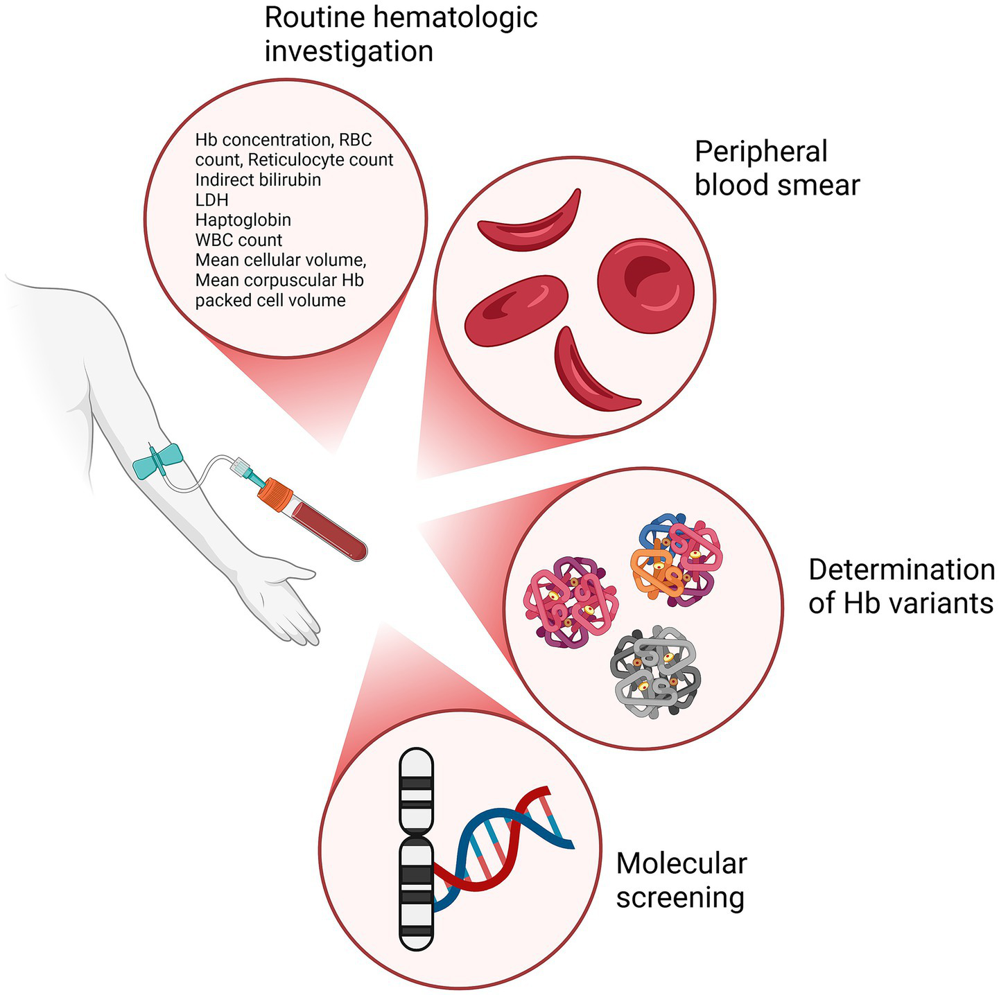 Diagnostic techniques for SCD investigation and the relative outcomes. Primary diagnostic approaches used in the evaluation of SCD: routine hematologic investigation to assess key hematological parameters, peripheral blood smear to assess the shape, size, and morphology of RBCs, determination of Hb variants identifying different Hb types, and molecular screening to identify mutations in the DNA, particularly on genes related to Hb production. Created in BioRender (2024) https://BioRender.com/c90x086.
