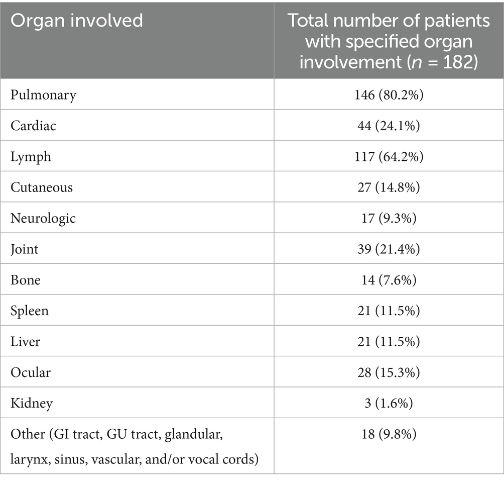 There were 182 patients eligible for data review, of whom 81.8% of sarcoidosis cases were biopsy-proven. For the purposes of this manuscript, patients listed as male were presumably carriers of sex-determining region Y (SRY), and patients listed as female were presumably without SRY. Patient gender identity was obtained through the electronic health record review. The mean age of patients was 52.5 years old, of which 101 were female (55.4%) and 81 were male (44.5%). The patients had multiorgan involvement in 65.3% of cases (119/182). Total distribution of organ involvement for all patients is documented in Table 1.