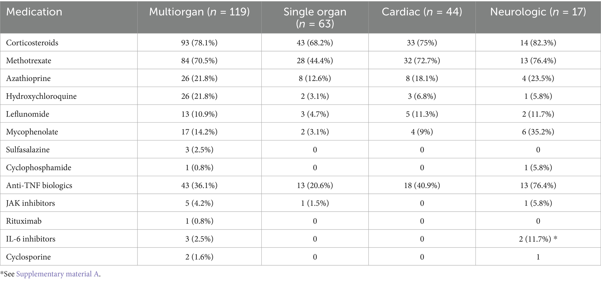Table 2. Sarcoidosis involvement (multiple organs, single organ, cardiac, and neurologic) and the medication used for sarcoidosis treatment.