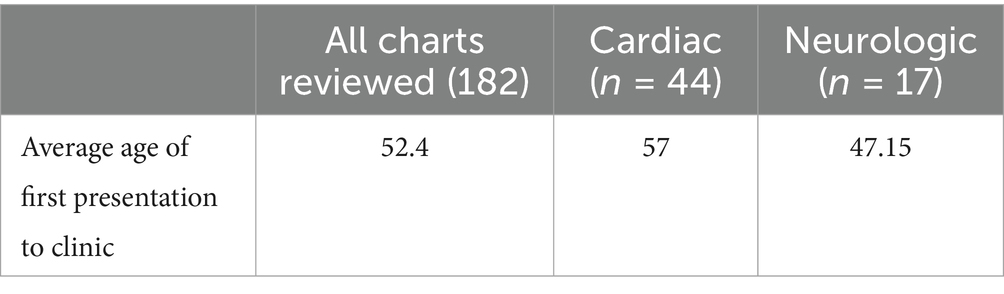 Table 4. Sarcoidosis involvement (multiple organs, single organ, cardiac, and neurologic) and average age of first presentation to multidisciplinary clinic in years.