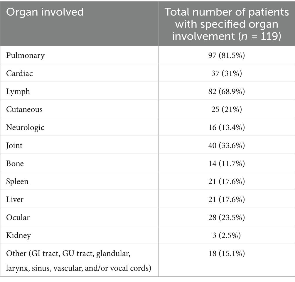 Multiorgan sarcoidosis involvement was present in 119/182 patients. The mean age of these patients was 52.7 years old, 68 (57.1%) of whom were female. The distribution of organs involved for these patients with multiorgan involvement are outlined in Table 5. The nonfractional mean number of systems involved in multiorgan involvement was 3. The medications used for the treatment for patients with multiorgan involvement are outlined in Table 2.