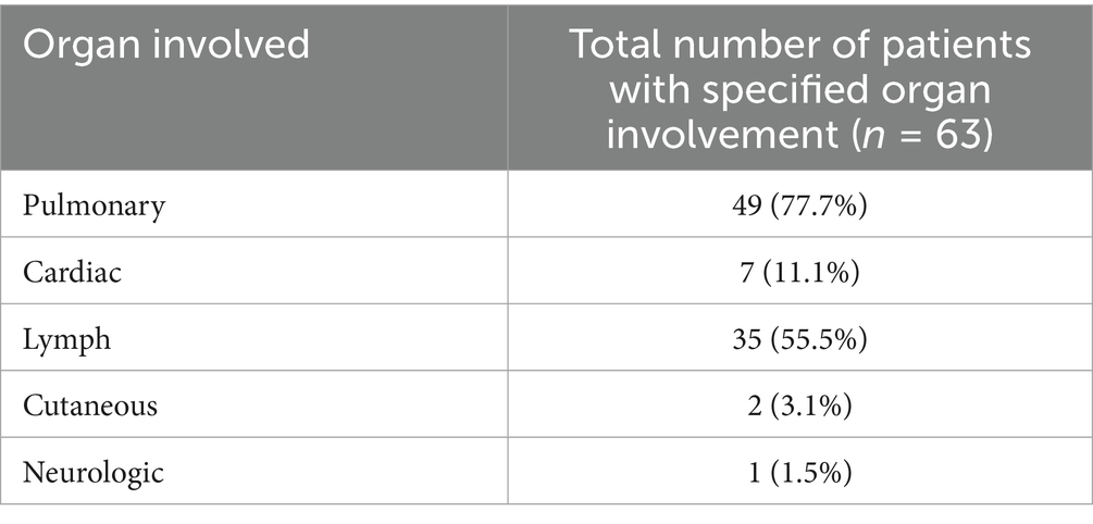 Single organ involvement or involvement isolated to lung and lymphatic systems was found in 63/182 patients with an average age of 54 years old, 33 (52.3%) of whom were female. The distribution of organs involved for patients with single organ involvement, or involvement isolated to lung and lymphatic systems, are outlined in Table 6. The medications used for treatment for patients with single organ involvement, or involvement isolated to lung and lymphatic systems, are outlined in Table 2. This category of single organ involvement also encompassed patients with isolated cardiac disease.