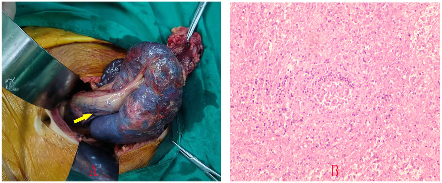 On August 27, 2024, the patient underwent a lower midline laparotomy. This approach was selected due to the large size of the spleen and the twisted splenic pedicle, which necessitated a thorough exploration of the abdominal cavity. Intraoperatively, the spleen was found in the lower abdomen and pelvic cavity, free and measuring approximately 18 cm × 10 cm. The spleen was dark red, with marked congestion and edema, hard texture, high surface tension, and mottled necrosis in some areas. The perisplenic ligaments were absent. The vessels at the splenic hilum were tortuous and congested, with the splenic artery and vein being particularly tortuous and rotated clockwise by approximately 360°. Some of the proximal small bowel mesentery was slightly twisted (Figure 3A). Intestinal adhesion lysis, splenectomy, and mesenteric repositioning were performed. A drain was placed in the pelvic cavity, exiting through the lower left abdomen and secured, to monitor for postoperative bleeding and infection. Postoperative pathology revealed localized hemorrhage and necrosis in the submitted splenic tissue (Figure 3B).