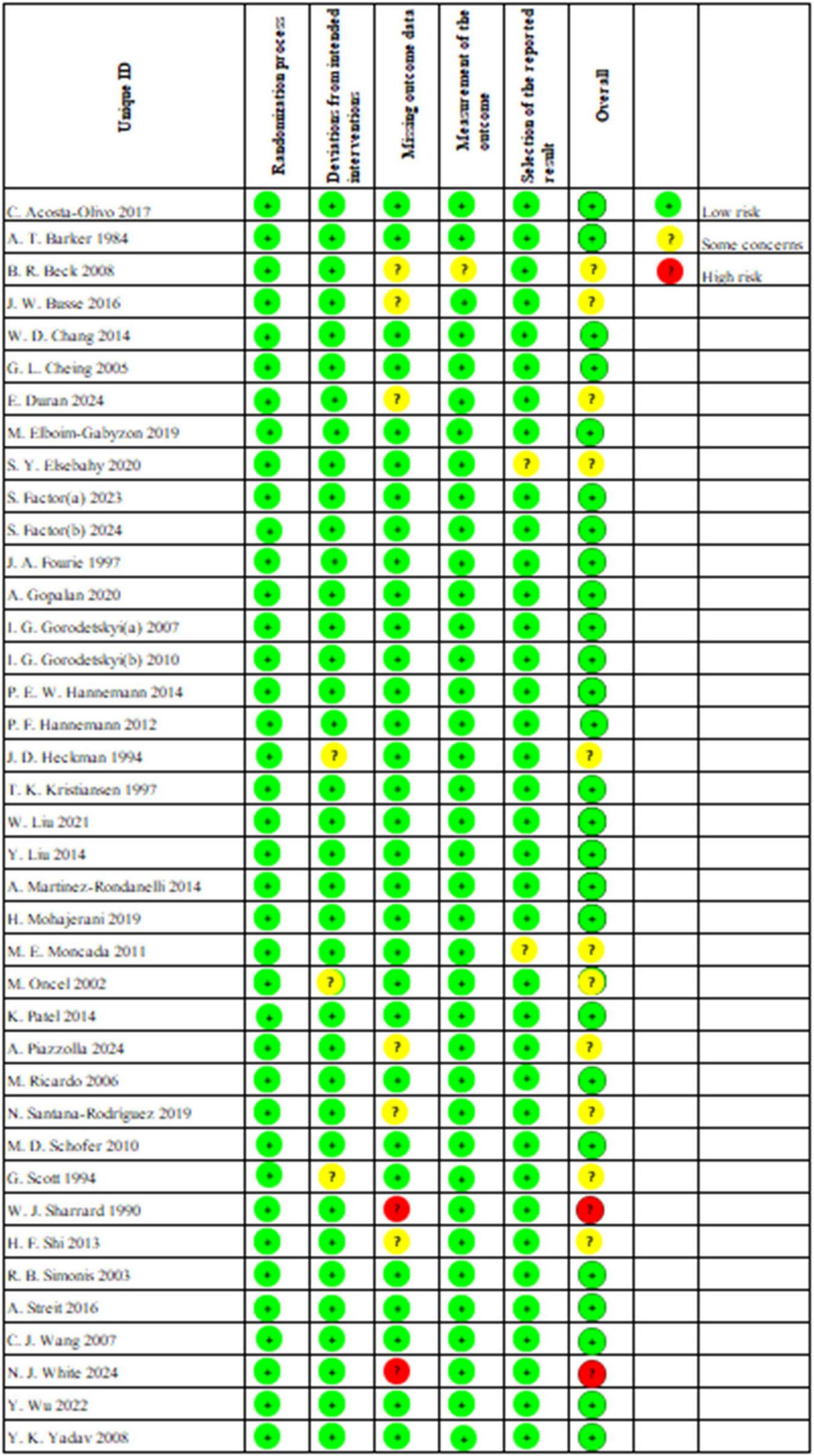 We conducted an assessment of the risk of bias, the results of which are illustrated in Figure 2. Among the studies, 26 indicated a low risk of bias, 11 reported a moderate risk, and 2 demonstrated a high risk. All studies reported randomization. However, J. D. Heckman et al. (53), M. Oncel et al. (60) and G. Scott et al. (66) conducted unplanned treatments during the intervention phase, leading to their classification as moderate risk. W. J. Sharrard et al. (67) and N. J. White et al. (72) were deemed high risk due to individual participants withdrawing from the trial as a result of the intervention. Furthermore, B. R. Beck et al. (38), J. W. Busse et al. (39), E. Duran et al. (42), A. Piazzolla et al. (62), N. Santana-Rodríguez et al. (64) and H. F. Shi et al. (68) were classified as moderate risk due to dropout or loss to follow-up for personal reasons, whereas all other studies reported no loss of outcome data. B. R. Beck et al. (38) was also rated as moderate risk for failing to assess whether fractures had fully healed based on imaging reports; all other studies were classified as low risk. Additionally, all studies, except for S. Y. Elsebahy et al. (44) and M. E. Moncada et al. (59), did not show any potential risk of selective reporting bias.