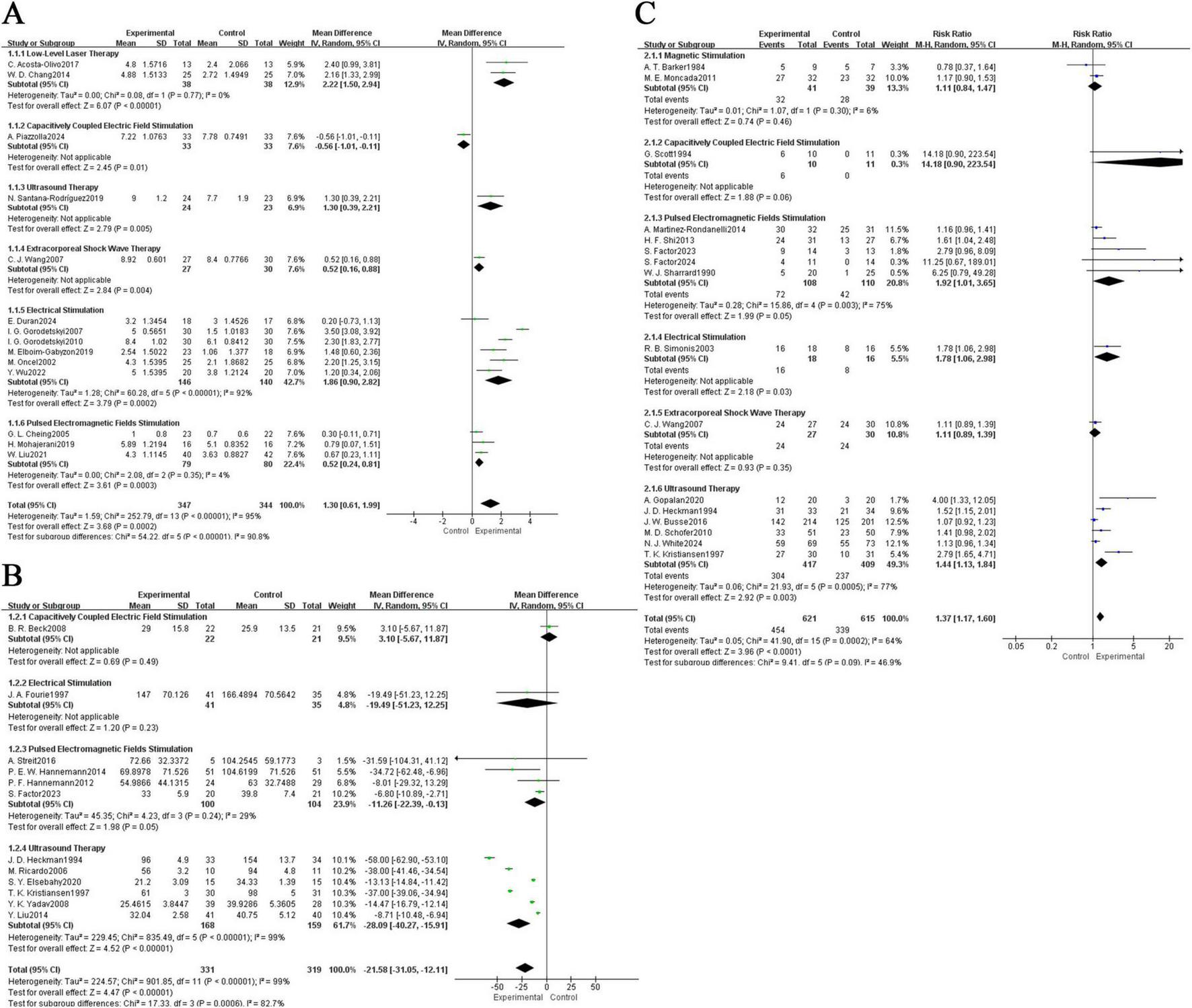 Studies that met the following criteria were included: (1) Patients with fractures or delayed healing following a fracture, regardless of fracture location and severity. (2) Physical agent modalities involving one or more of the following: Electrical Stimulation (ES), Pulsed Electromagnetic Fields Stimulation (PEMFS), Ultrasound Therapy (UST), Low-Level Laser Therapy (LLLT), Magnetic Stimulation (MS), Extracorporeal Shock Wave Therapy (ESWT), and Capacitively Coupled Electric Field Stimulation (CCEFS). (3) Control groups receiving either placebo stimulation or standard treatment alone. (4) studies reporting at least one outcome of interest, including pain, time to complete fracture healing, and the number of cases of complete fracture healing. (5) Randomized controlled trial (RCT) design. We excluded: ➀ Non-human studies; ➁ Studies lacking quantifiable outcome measures; ➂ Studies not involving disease models; ➃ Case reports, reviews, editorials, commentaries, conference abstracts, and articles not in English.