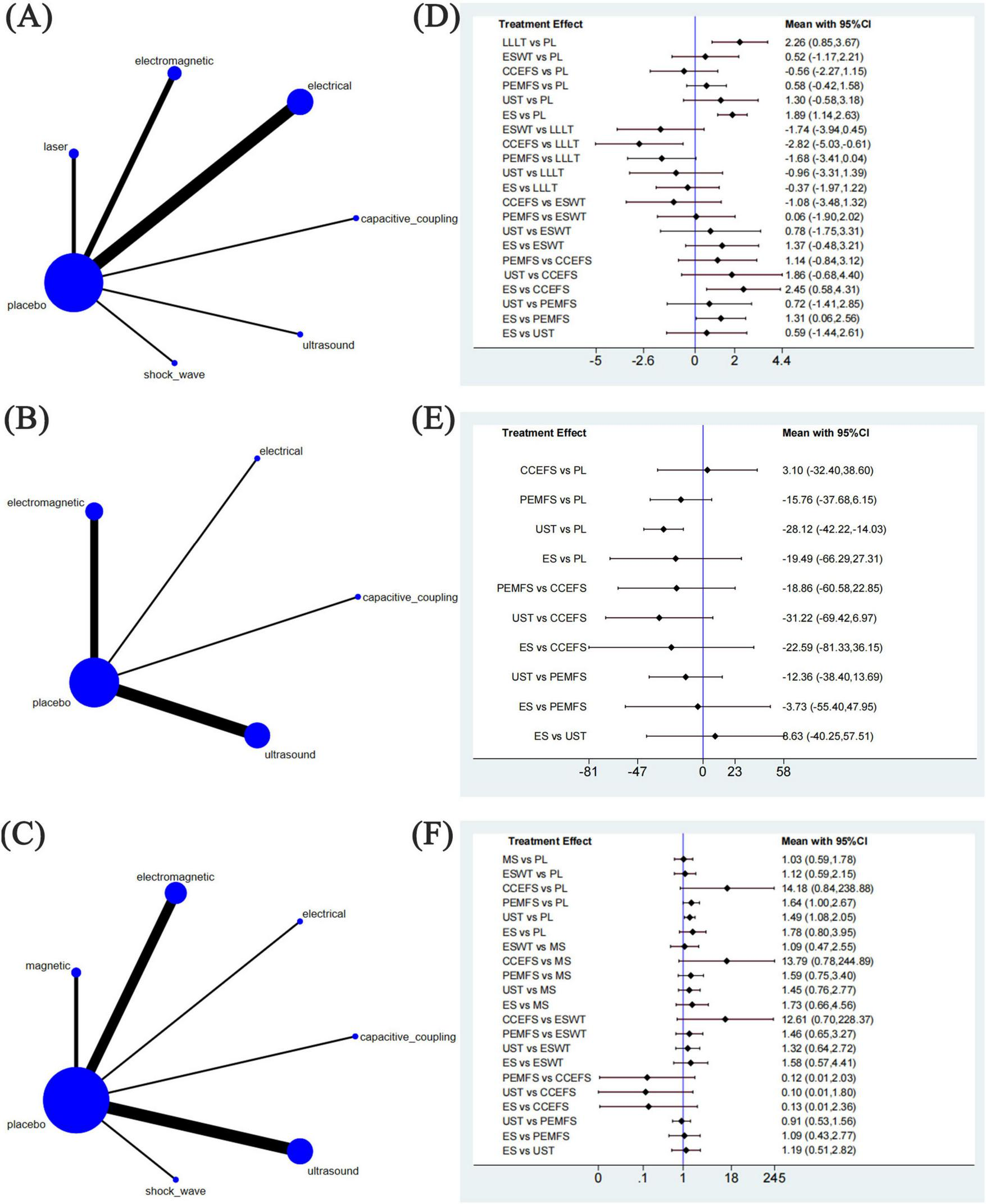 Network meta-analysis of physical agent modalities for fractures. (A–C) Network evidence plots for fractures. (D–F) Forest plot represents the direct and indirect comparison. PL, placebo; LLLT, low-level laser therapy; MS, magnetic stimulation; ESWT, extracorporeal shock wave therapy; CCEFS, capacitively coupled electric field stimulation; PEMFS, pulsed electromagnetic fields stimulation; UST, ultrasound therapy; ES, electrical stimulation.