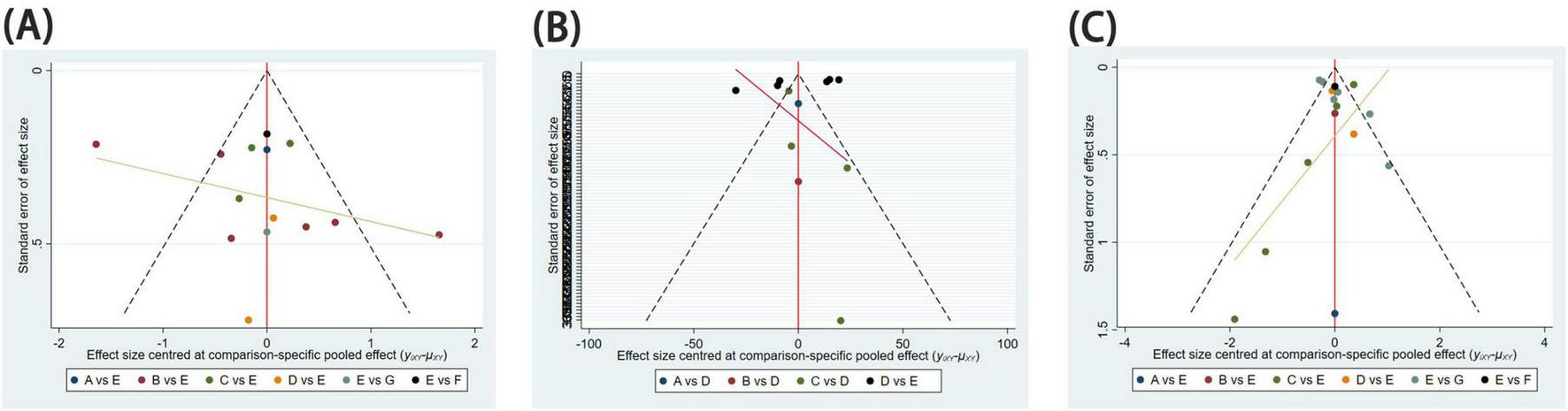 In this study, for dichotomous outcomes, we reported risk ratios (RR) with 95% credible intervals, while for continuous outcome variables, we reported mean differences (MD) with 95% confidence intervals (CIs). Traditional meta-subgroup analyses were conducted using Review Manager 5.4.1, while calculations and visualizations were carried out using R 4.4.3 (R Foundation for Statistical Computing) and Stata SE 15.1 (StataCorp, College Station, TX). Given the heterogeneity between trials, we employed a Bayesian hierarchical random effects model for multiple comparisons (25, 26). Based on the theory of the likelihood function and certain initial assumptions, we performed Markov Chain Monte Carlo (MCMC) simulations using R 4.4.3, with 500,000 iterations and 20,000 for annealing to investigate posterior distributions (27–29). We assessed model goodness-of-fit by calculating the deviance information criterion (DIC) and employed the node splitting method to compare the consistency of direct and indirect evidence for each comparison (30). To address heterogeneity in the study, a random effects model was employed, and the degree of heterogeneity was quantified using the I2 statistic. To rank the interventions, we calculated the Surface Under the Cumulative Ranking Curve (SUCRA) probability values, which range from 0 to 1, with higher values indicating that the intervention is more likely to be the most effective (31, 32). A network diagram was created to analyse the geometrical structure of the intervention network and to identify potential biases, with the size of the nodes representing the number of participants in each group and the thickness of the lines reflecting the number of studies. A conjugate prior distribution was used for the Bayesian network meta-analysis (NMA), and a ranking table was generated to illustrate the comparisons of each pair of interventions for each outcome. Pairwise meta-analyses were conducted using the DerSimonian-Laird random effects model to estimate the variance of heterogeneity and obtain direct evidence (33). Finally, we utilized a comparison-adjusted funnel plot to assess potential publication bias (34, 35). Furthermore, sensitivity analyses were performed to explore their potential impact on the conclusions.