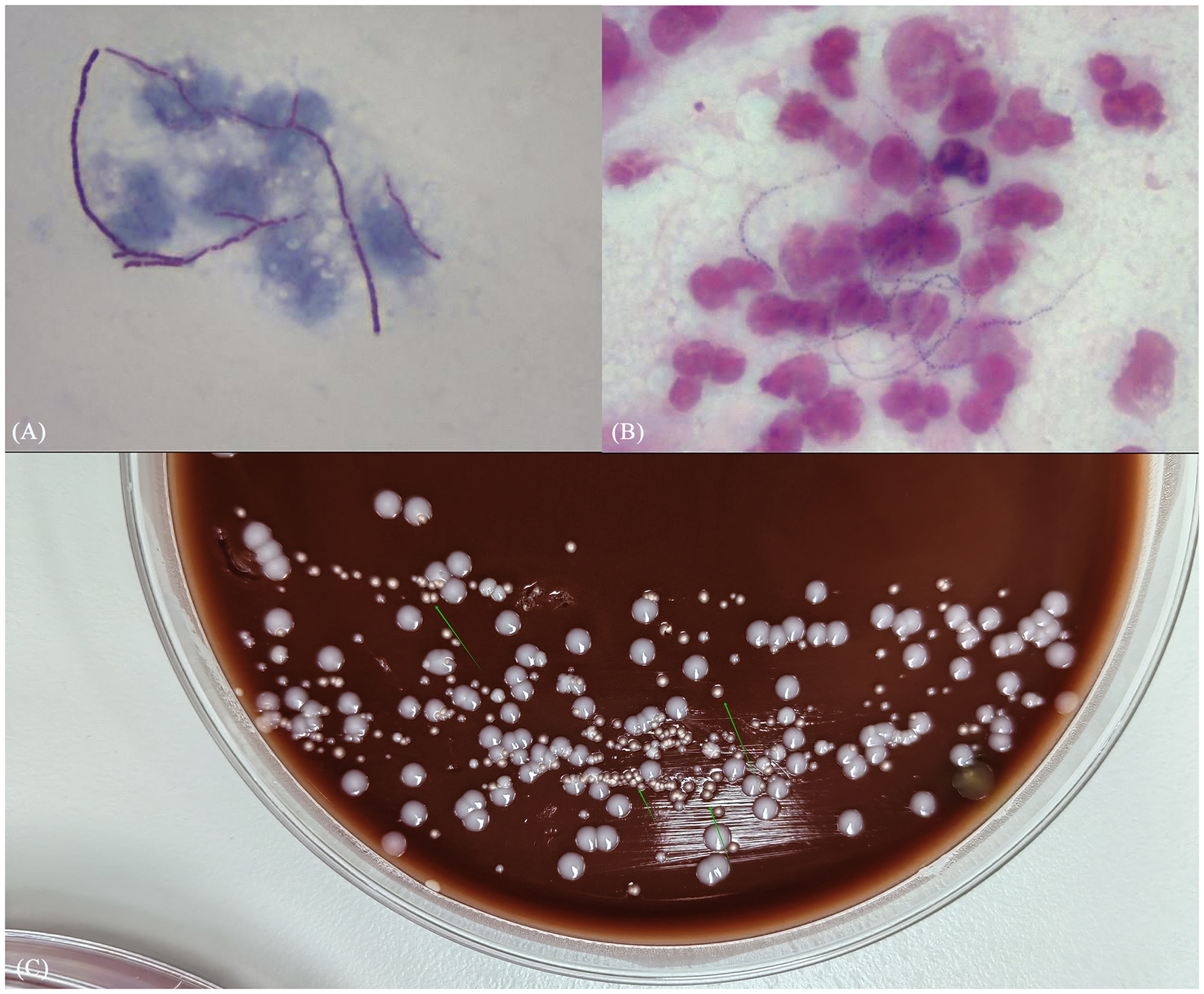 (A) Gram stain smear of alveolar lavage fluid showed weakly positive, bead-like hyphae; (B) weak acid-fast staining revealed dendritic red hyphae; (C) culture results identified pale white dry colonies.