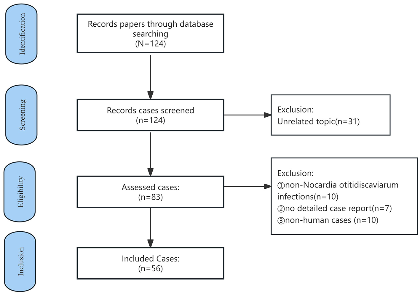 A literature search was conducted in Pubmed using the keyword “Nocardia otitidiscaviarum” covering the period 1980–2024. Case reports lacking detailed patient information, non-N. otitidiscaviarum infections, and non-human studies, as well as those unrelated to N. otitidiscaviarum infections in humans, were excluded (see Figure 4). Demographic information, including age, sex, infection site, medical history, drug sensitivity test results and clinical outcomes, was extracted and compiled. Since this is a narrative review (rather than a systematic review), we aimed to synthesize diverse published experiences with N. otitidiscaviarum instead of conducting a formal meta-analysis. Statistical analyses were performed using SPSS version 26. Categorical variables were analyzed using chi-square tests or Fisher's exact tests. Continuous variables underwent t-test. Age was reported using mean ± standard deviation. Statistical significance was defined as p ≤ 0.05. Ultimately, 56 cases were included in this study (Table 2 and Supplementary Table S1 provided a summary of the features of all the included studies), all of which were case reports.