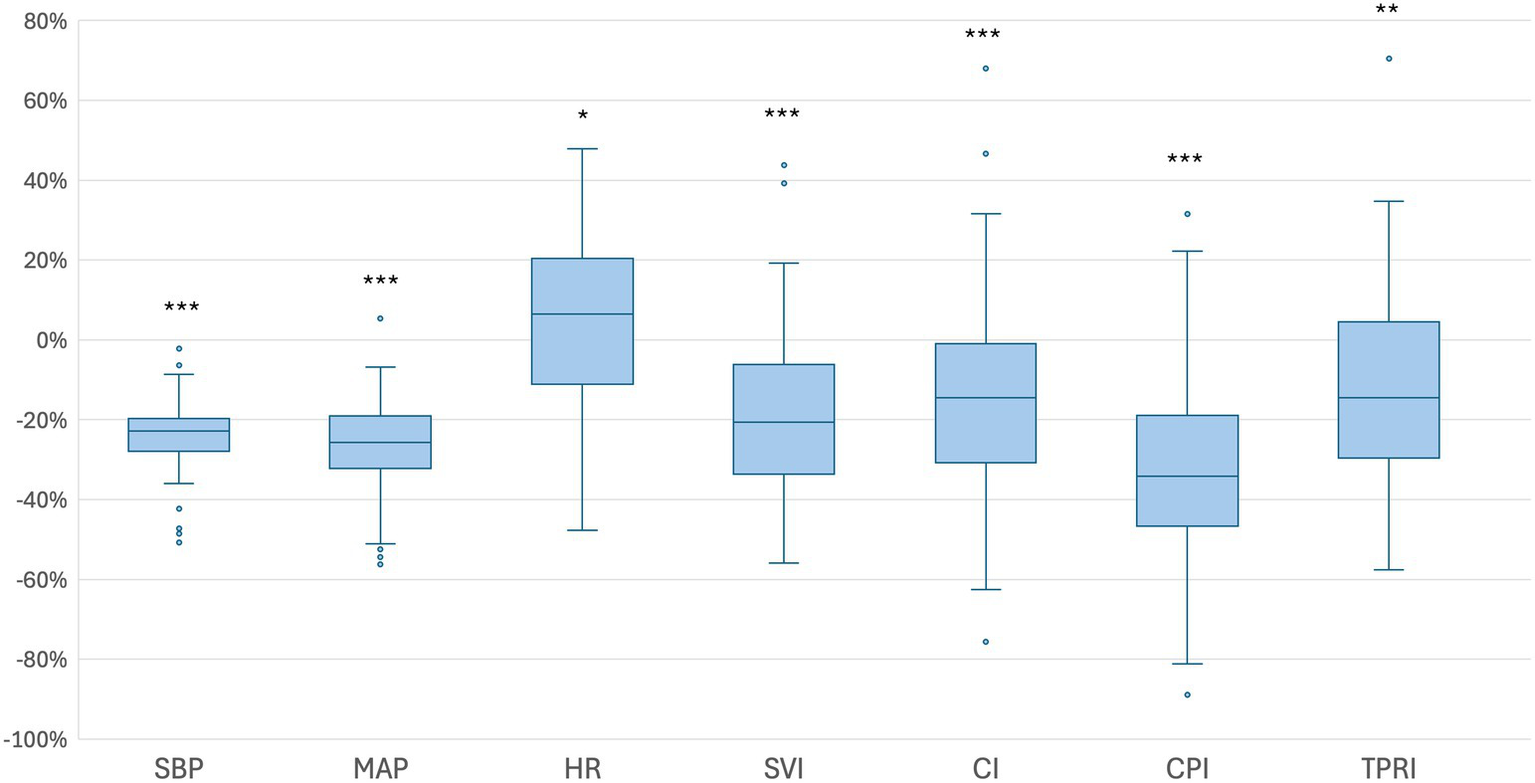 Descriptive analyses were conducted to summarize the relative changes in hemodynamic parameters before and after SPA. The distribution of continuous variables was assessed using the Shapiro–Wilk test. Because the data were not normally distributed, paired comparisons were performed using the Wilcoxon signed-rank test. Results were reported as median differences with corresponding interquartile ranges (IQRs). Statistical significance was set at a two-sided p-value <0.05. All statistical analyses were performed using SPSS Statistics version 30.0 (IBM Corp., Armonk, NY, USA) and Microsoft Excel version 16.92 (Microsoft Corp., Redmond, WA, USA).