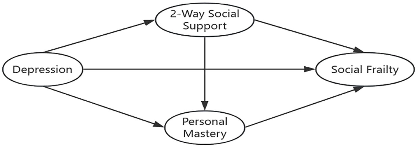 This study is grounded in Stress Theory, a psychological framework that conceptualizes stress as an intermediary process linking stressors to stress outcomes. Within this model, cognitive appraisal and social support function as key mediating variables. In the context of this study, personal mastery represents an individual’s cognitive reappraisal following exposure to stressors. For elderly MHD patients, stressors may include factors such as advanced age, cultural adaptation, and marital status, which can contribute to the development of depressive symptoms. Drawing from both theoretical perspectives and prior literature, the study posits that personal mastery (cognitive appraisal) and bidirectional social support (social support) mediate the relationship between negative emotions (stressors) and social frailty (stress outcome). Furthermore, existing evidence suggests that bidirectional social support can influence personal mastery (24), indicating a potential interactive pathway between these mediators. Based on the literature and theoretical rationale, a chain mediation model was constructed, as illustrated in Figure 1. The following research hypotheses were proposed: (1) depression directly predicts social frailty in elderly MHD patients; (2) bidirectional social support partially mediates the relationship between depression and social frailty; (3) personal mastery partially mediates the relationship between depression and social frailty; and (4) bidirectional social support and personal mastery jointly serve as multiple mediators in the relationship between depression and social frailty.